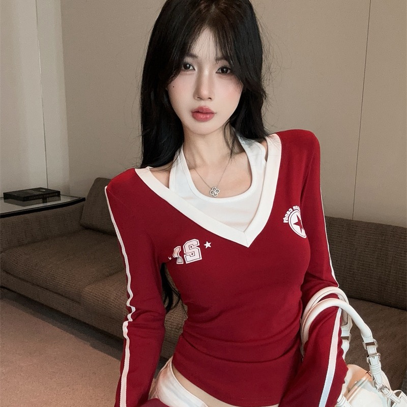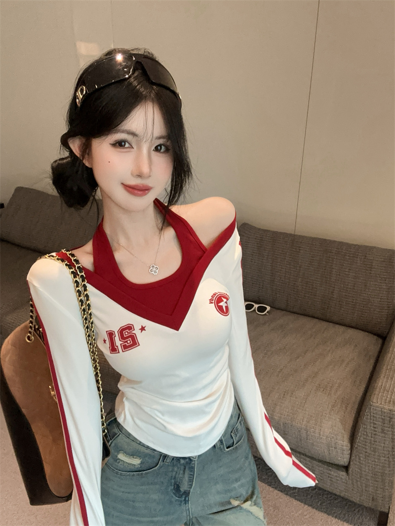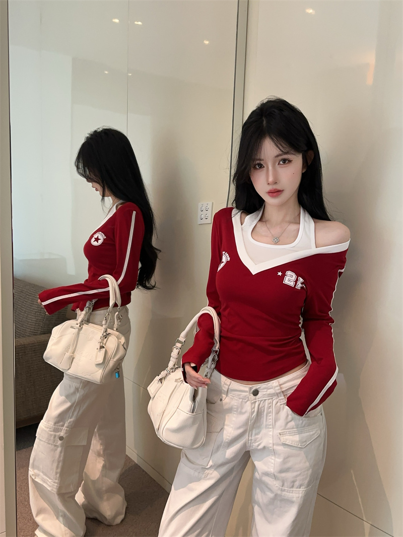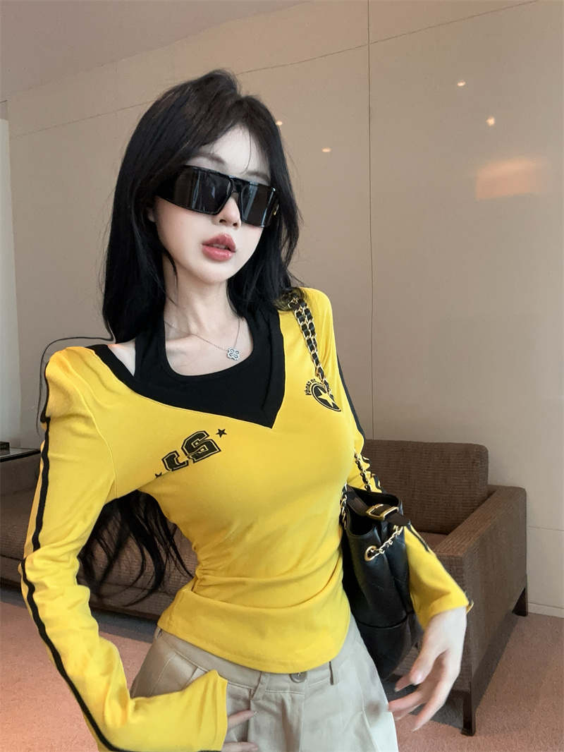 Home > 长袖T恤 > 春季新款设计感撞色挂脖假两件辣妹款修身收腰捏褶上衣 服裝批發女裝批發服飾貨源