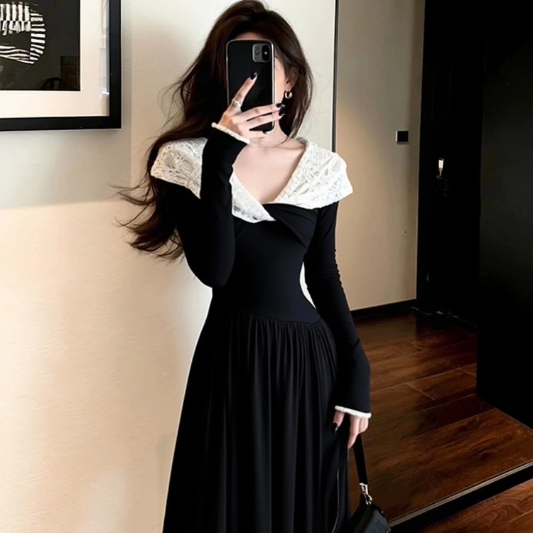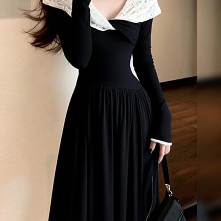 法式撞色一字肩黑色连衣裙女新款气质千金风露肩显瘦减 服裝批發女裝批發服飾貨源