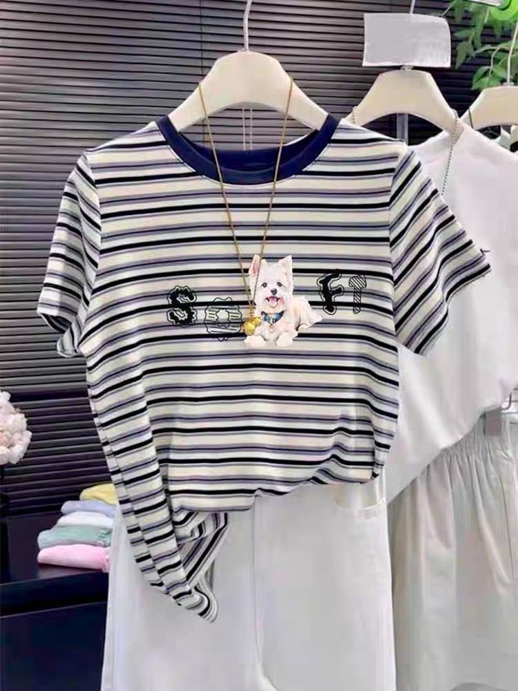 BY11085# 原版面料特大码300斤拼色条纹短袖T恤女夏装新款 服裝批發女裝批發服飾貨源