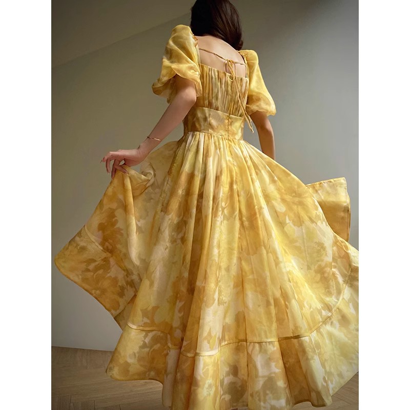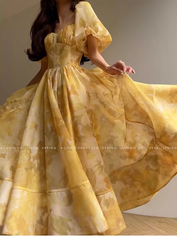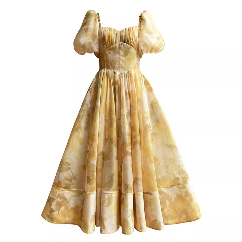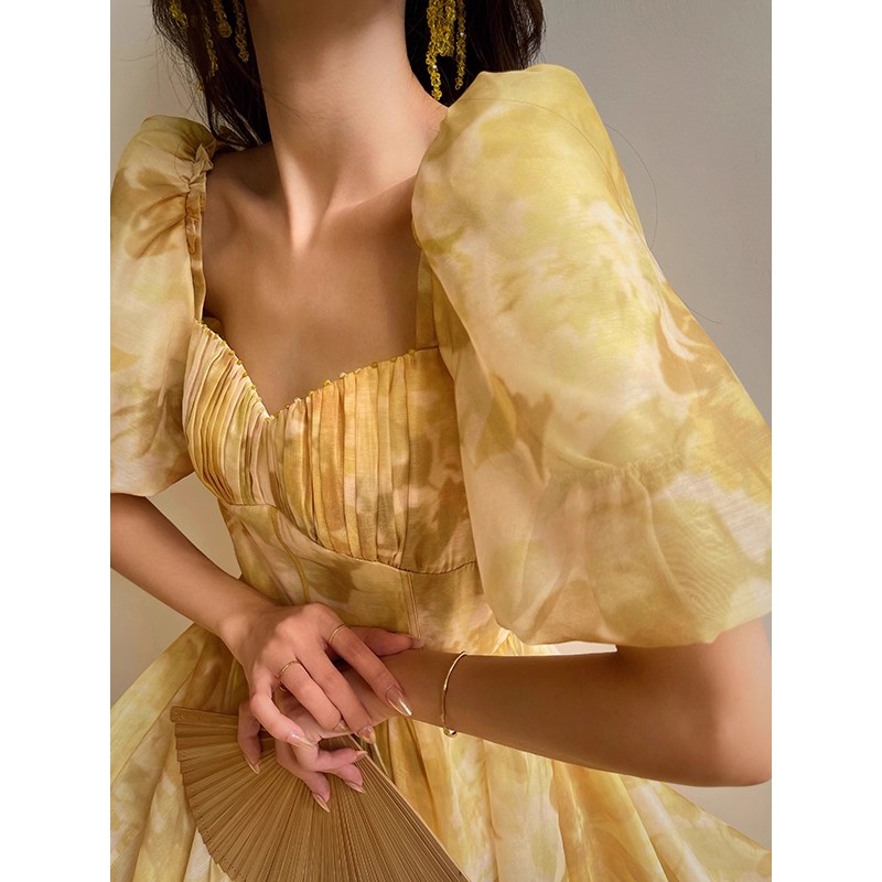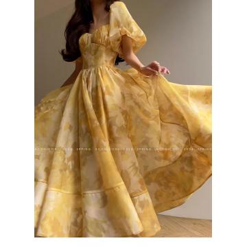 仲夏香柠法式印花茶歇裙收腰气质泡泡袖公主风连衣裙 服裝批發女裝批發服飾貨源