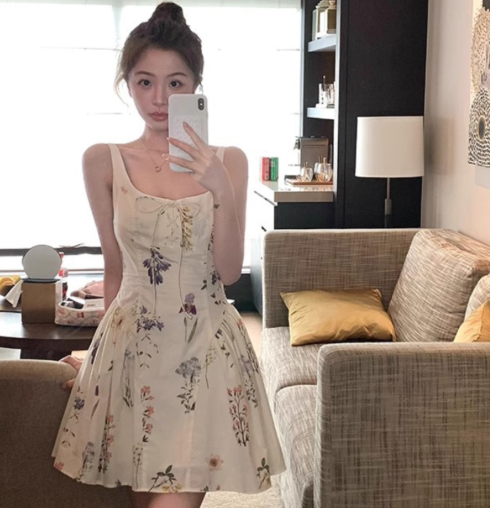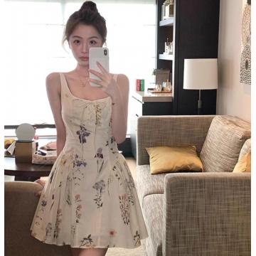 小白花裙子女夏季显瘦收腰系带碎花连衣裙 服裝批發女裝批發服飾貨源