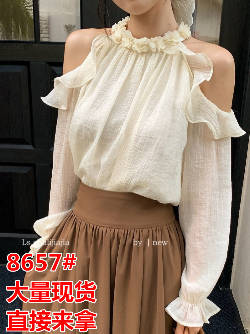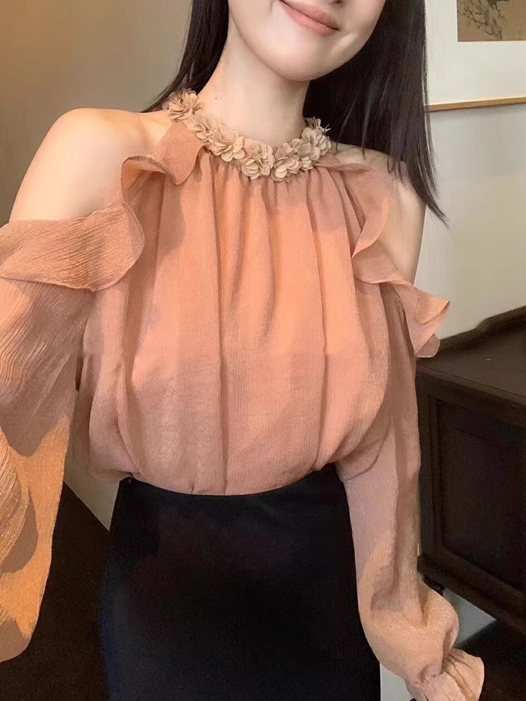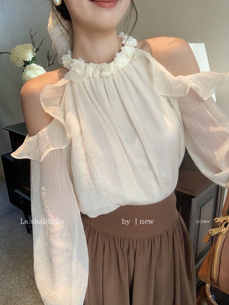 秋新款法式甜美荷叶边露肩花朵挂脖雪纺衫设计感小众气质长袖上衣 服裝批發女裝批發服飾貨源