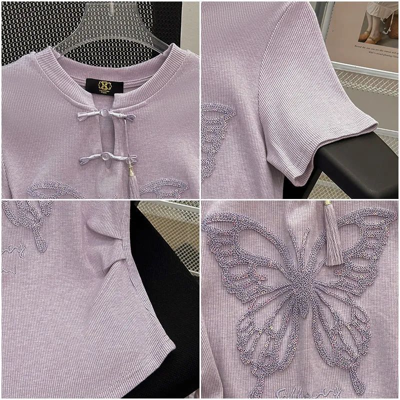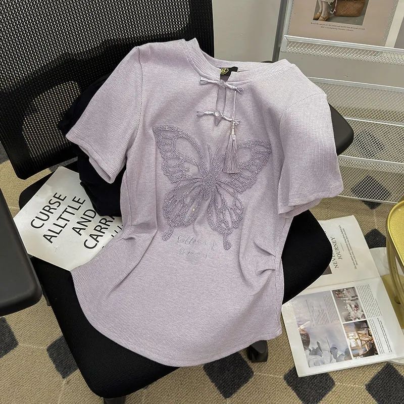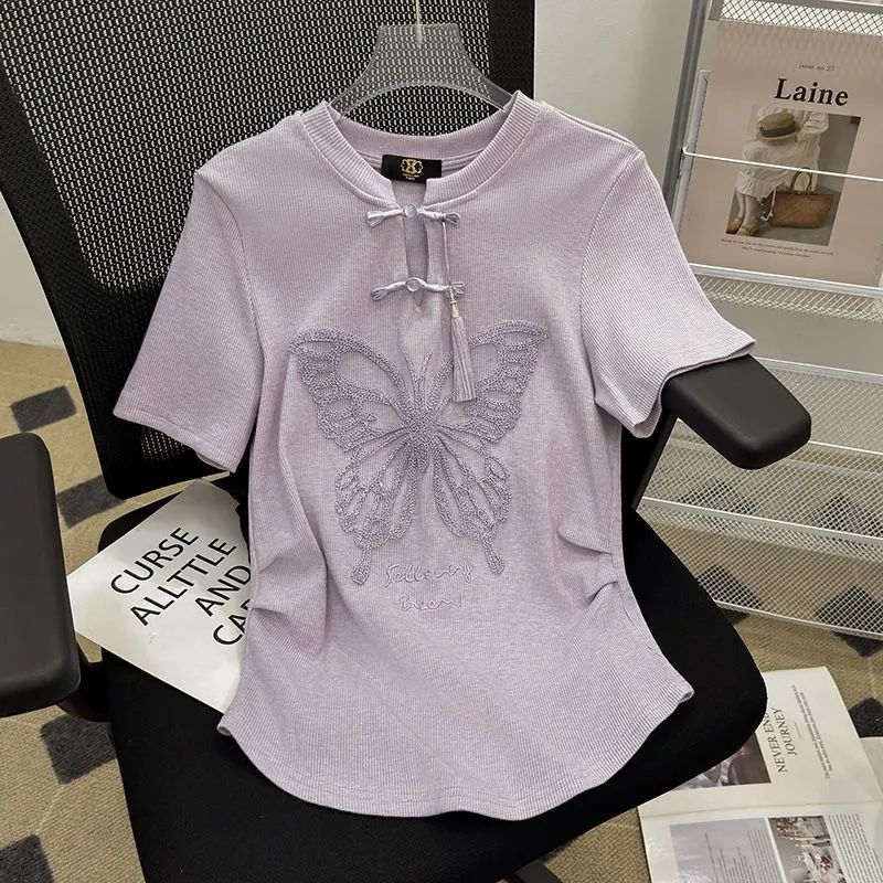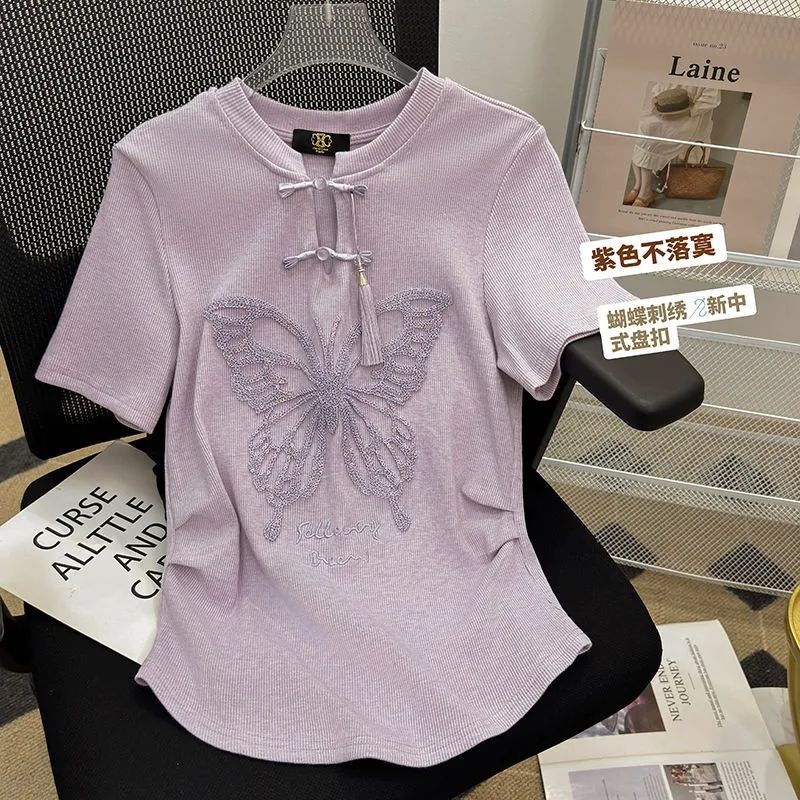 新中式国风盘扣短款上衣女新款设计感圆领独特别致刺绣T恤夏 服裝批發女裝批發服飾貨源