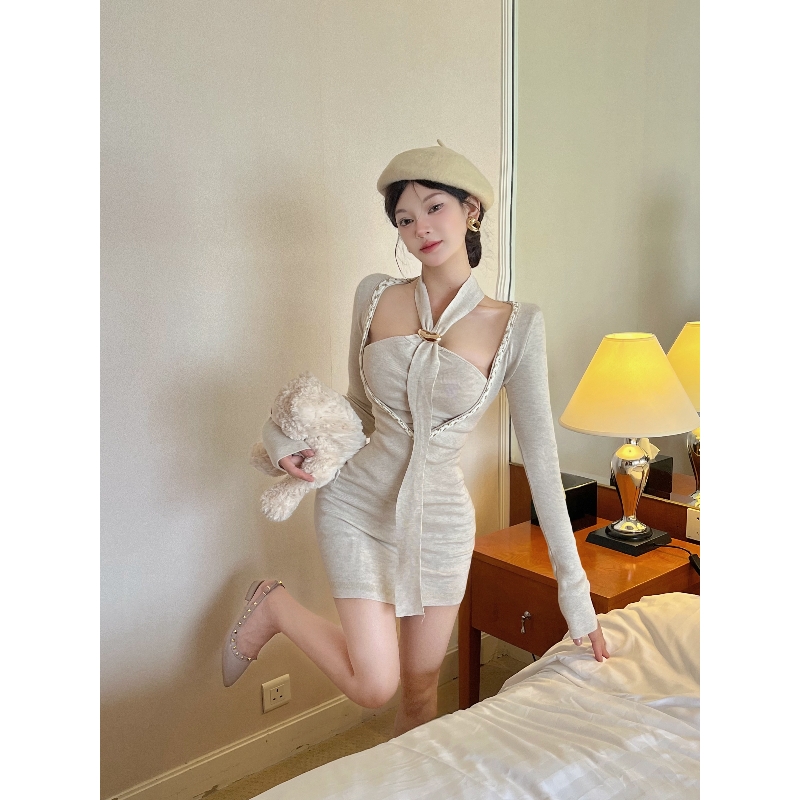 BY11307# 纯欲高级感法式编织拼接V领针织套装叠穿挂脖背心两件套 服裝批發女裝批發服飾貨源