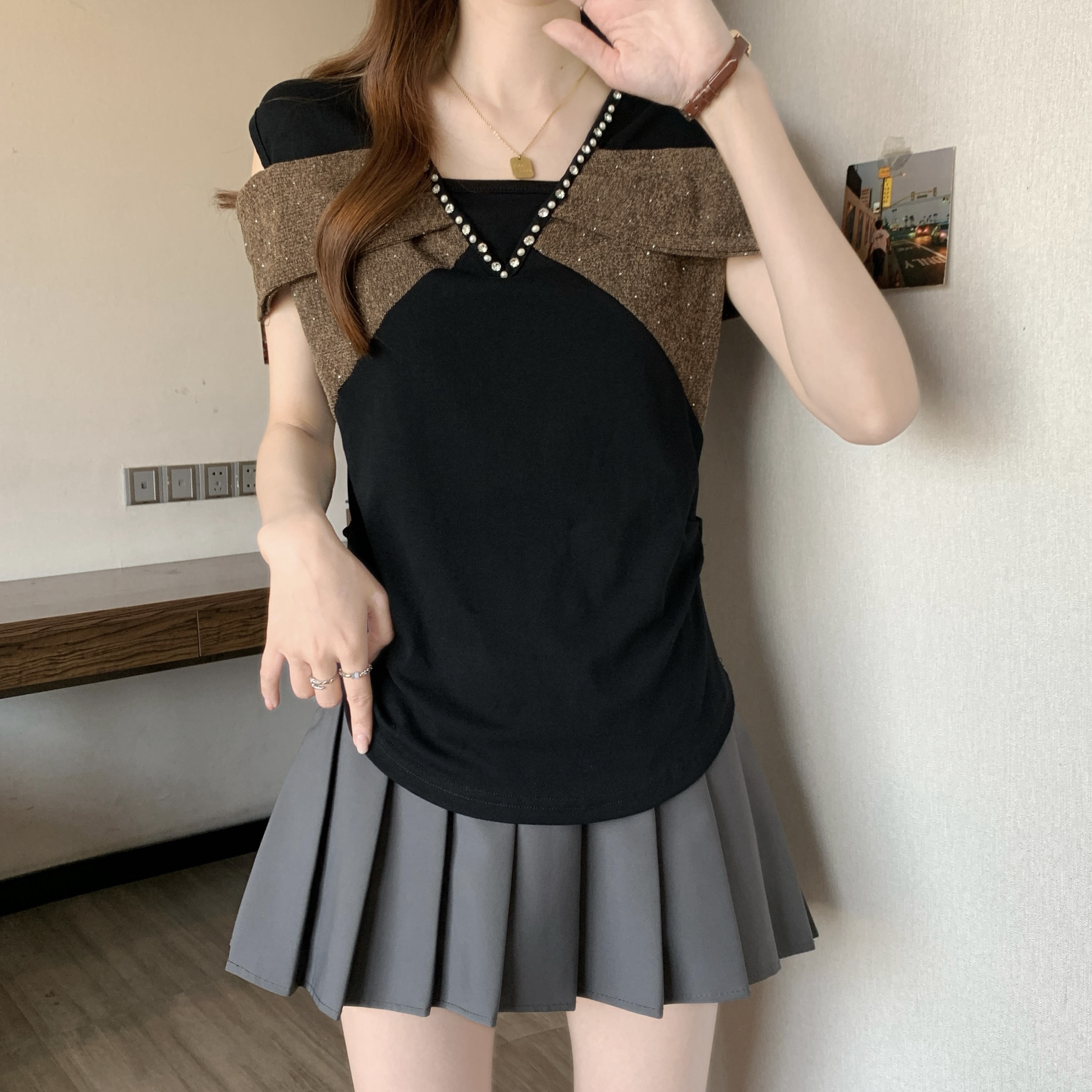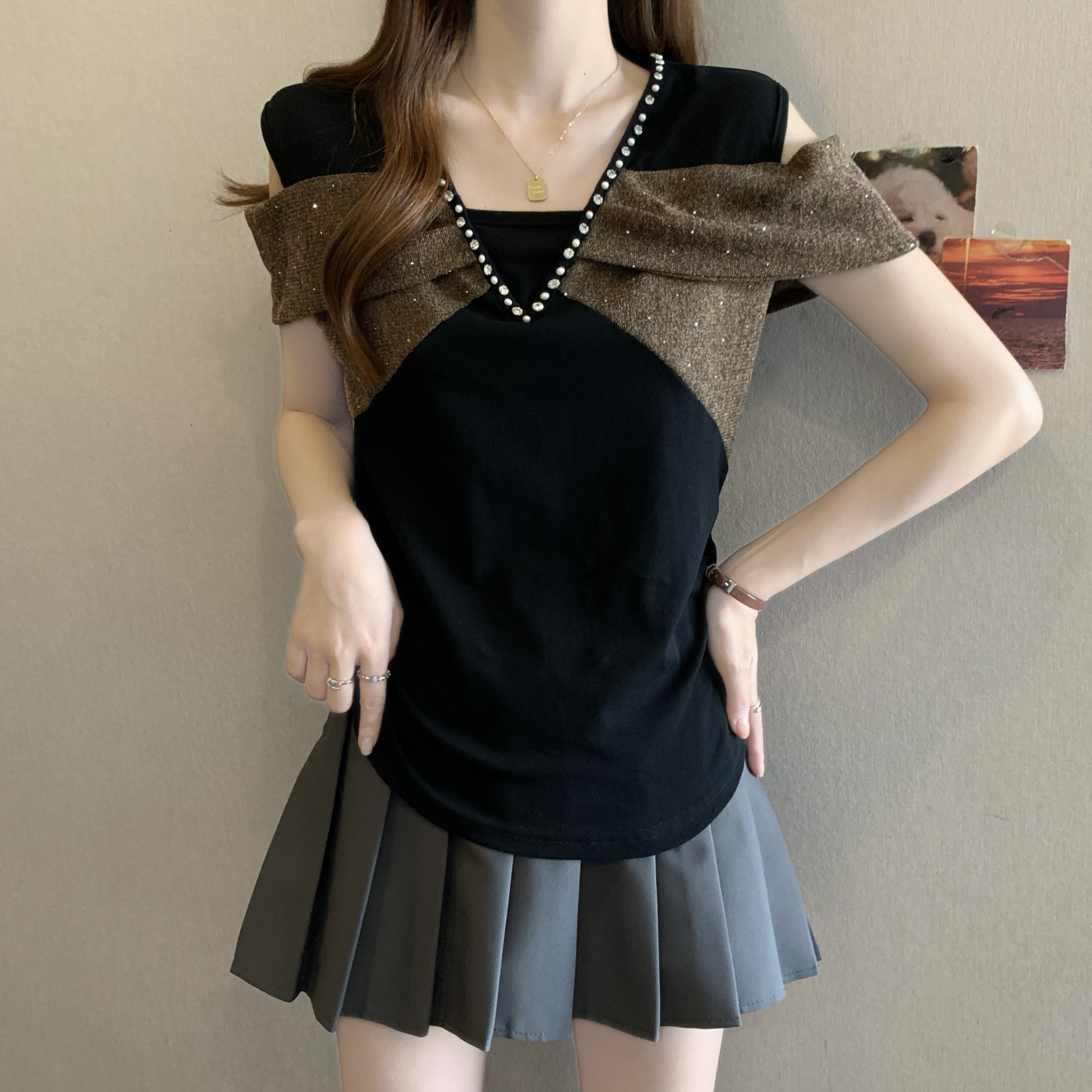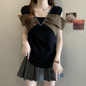 BY11332# 新款胖MM夏款时尚设计感一字肩小众假两件显瘦上衣 服裝批發女裝批發服飾貨源