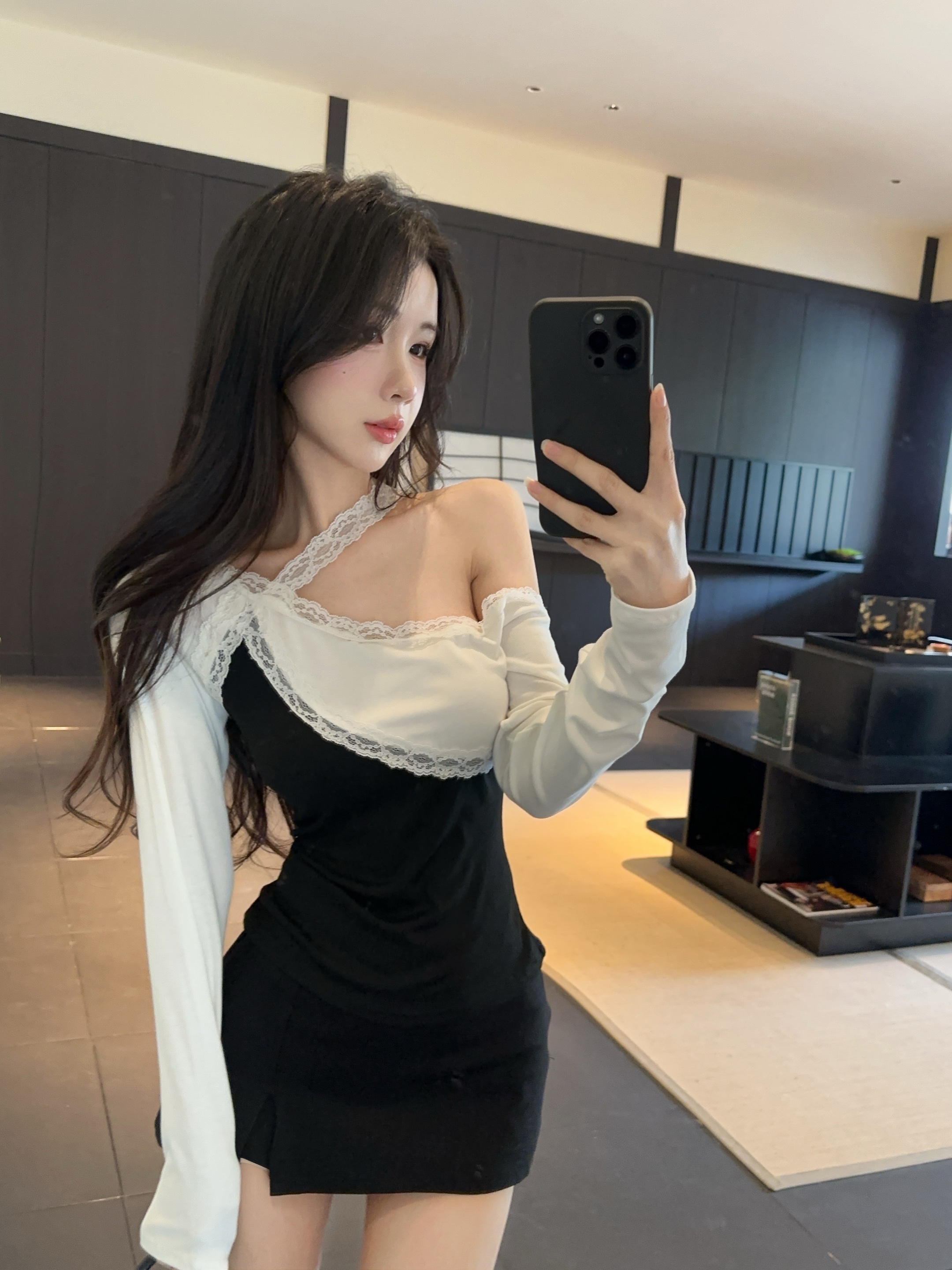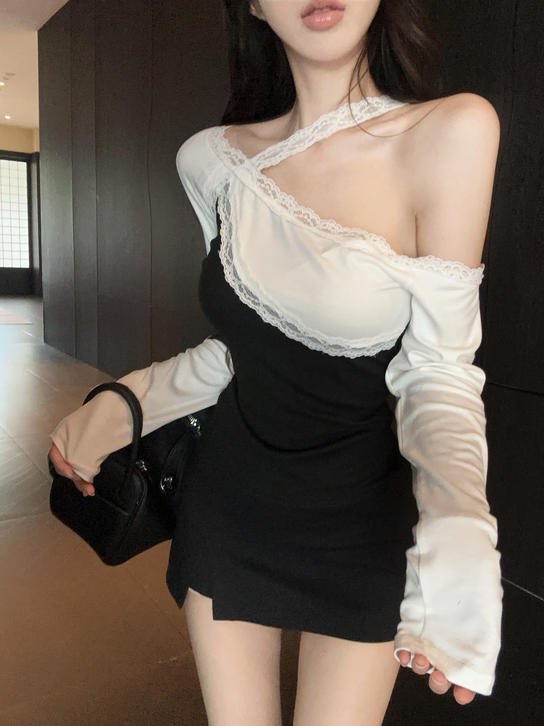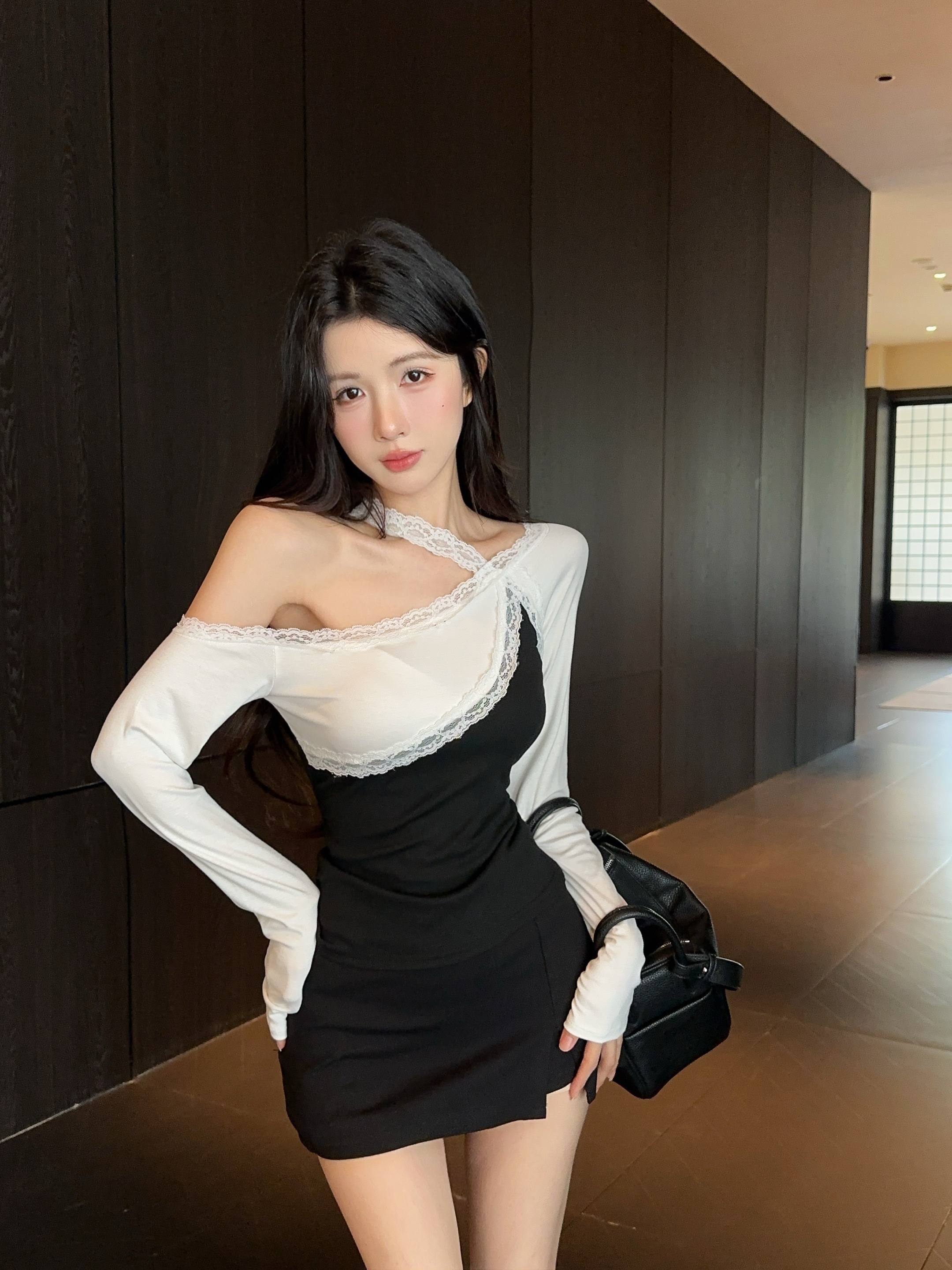 纯欲辣妹斜肩蕾丝拼色长袖露肩修身上衣 服裝批發女裝批發服飾貨源