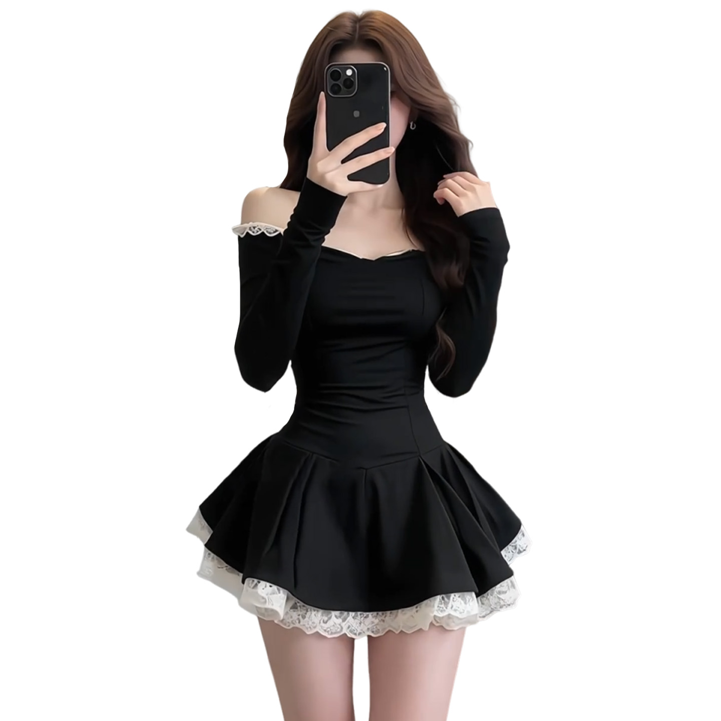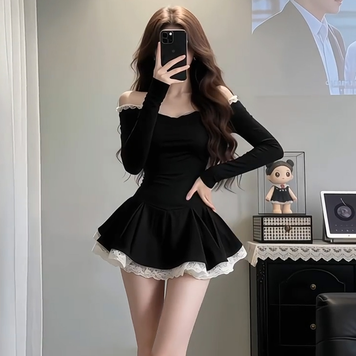 法式高级感黑色一字肩连衣裙女早春季新款蕾丝收腰裙性感纯欲 服裝批發女裝批發服飾貨源