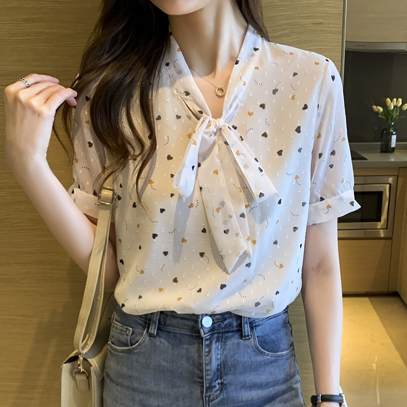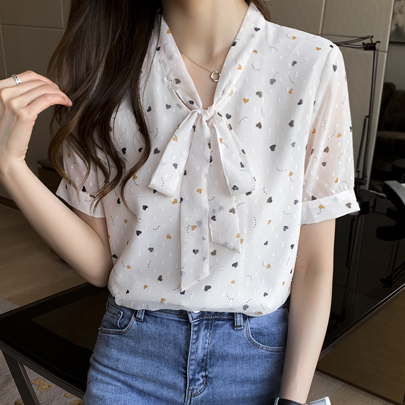 BY11634# 白色碎花雪纺衫女蝴蝶结小衫夏款新款遮肚显瘦上衣夏季 服裝批發女裝批發服飾貨源