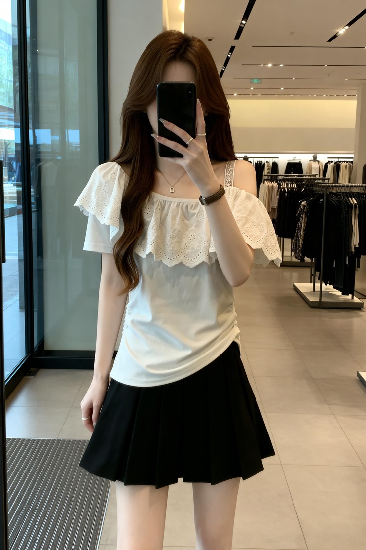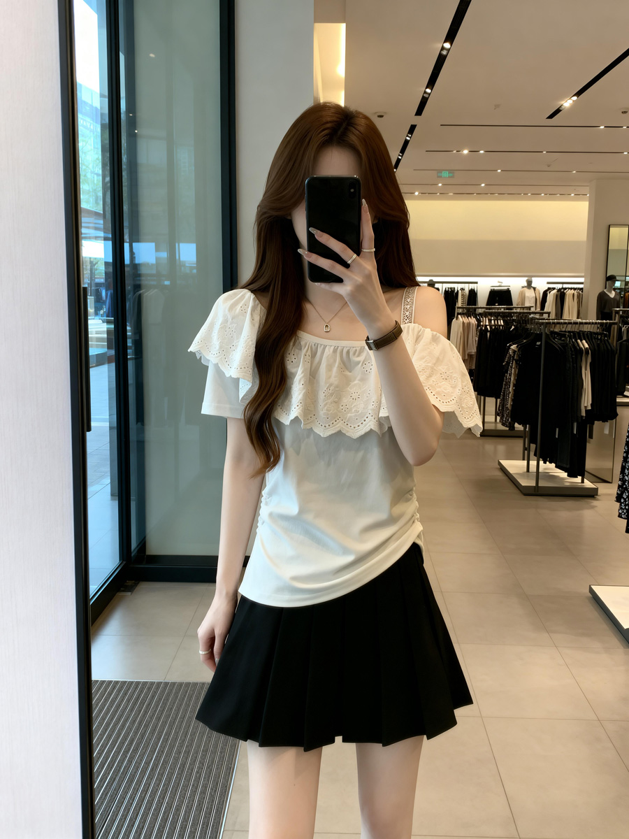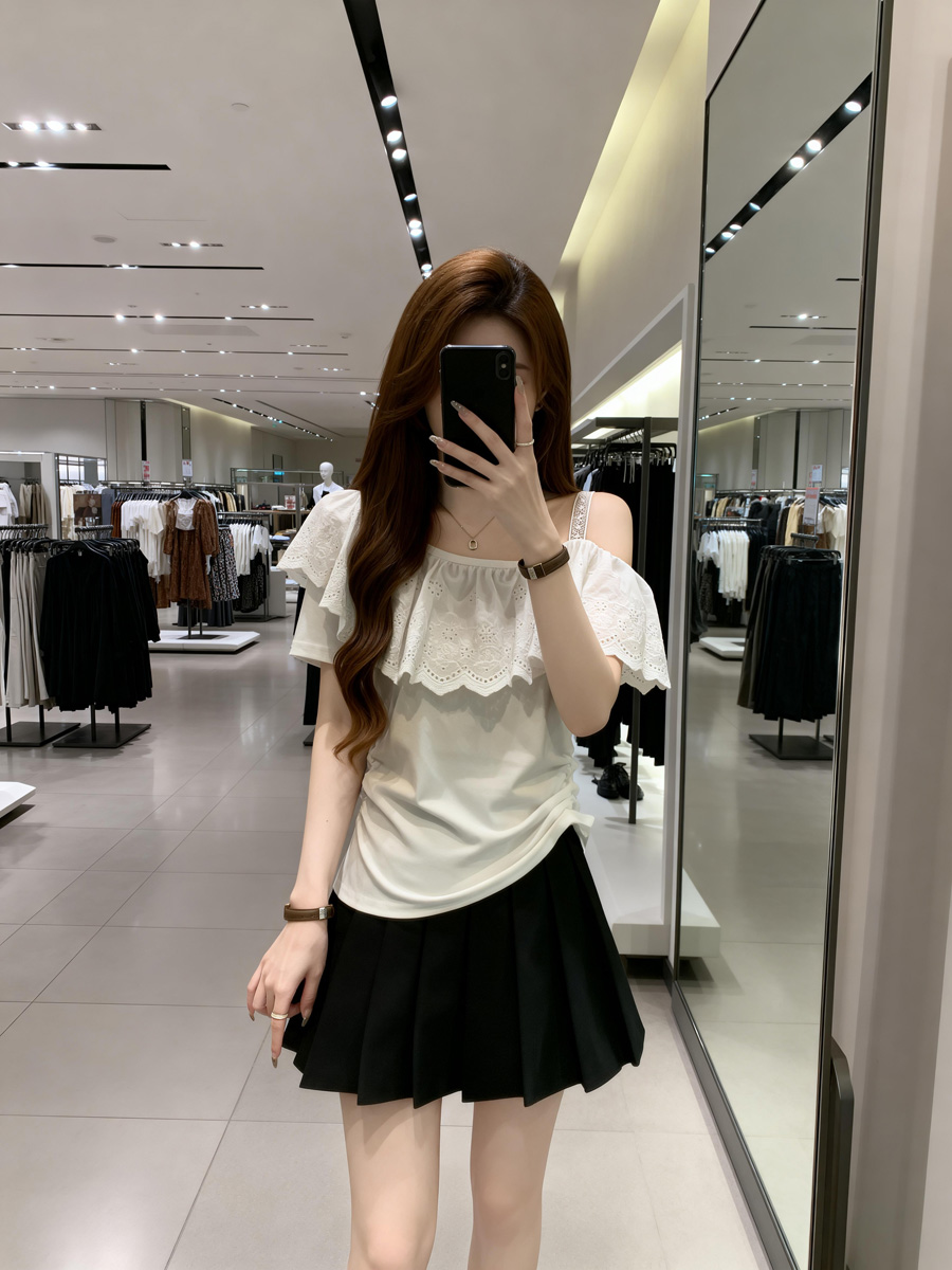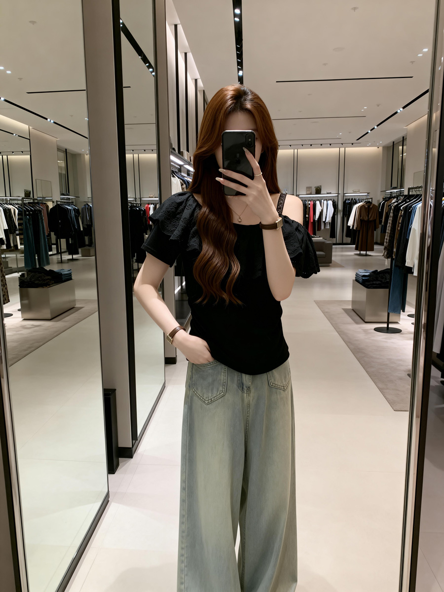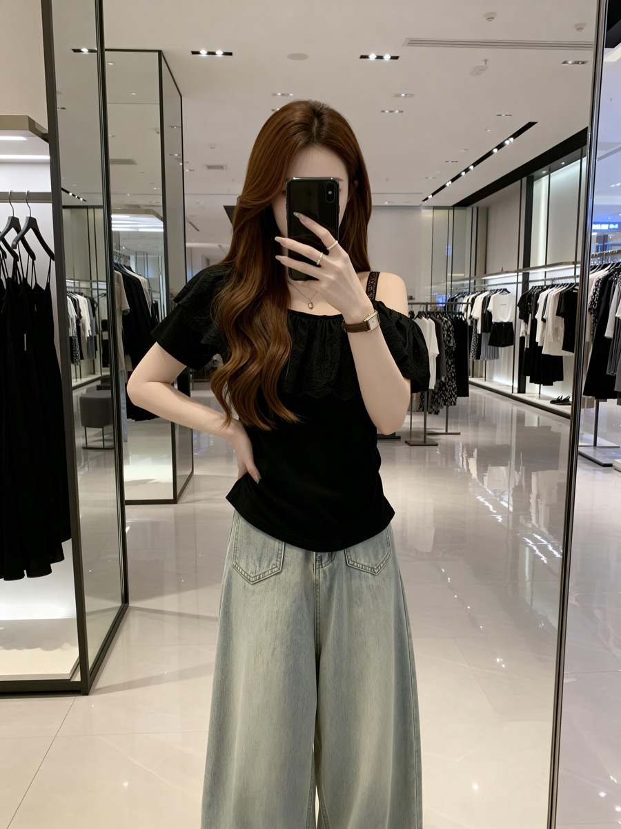 BY11911# 夏季新款个性花瓣领漏肩百搭针织T恤女胖mm休闲显瘦上衣 服裝批發女裝批發服飾貨源