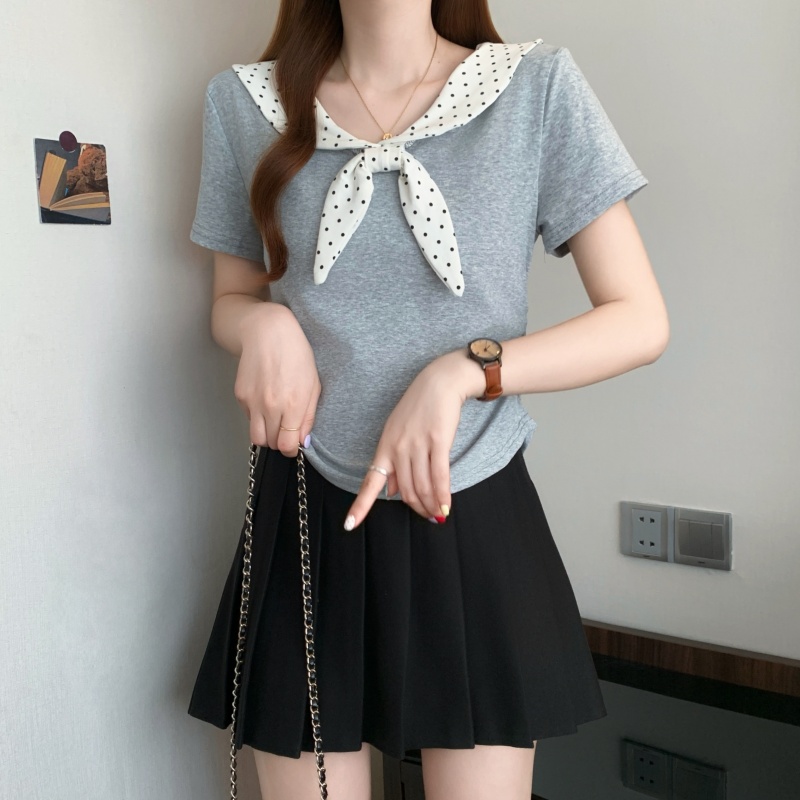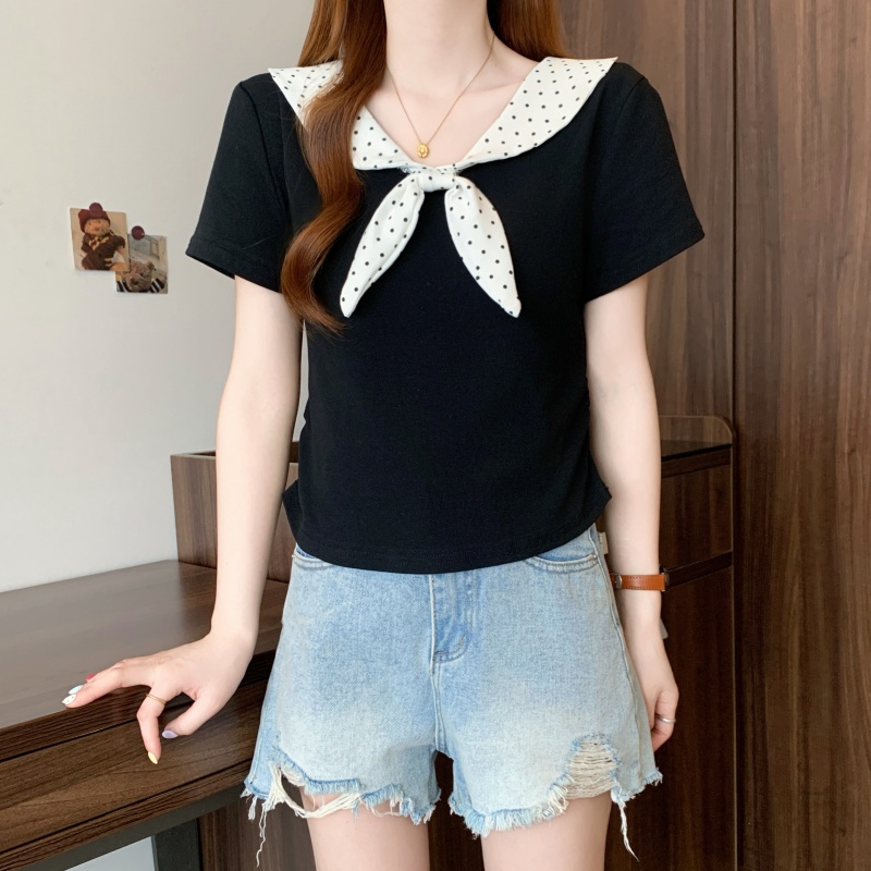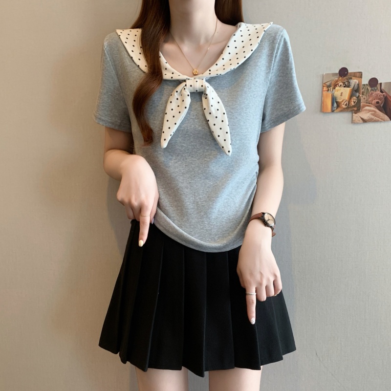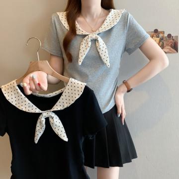BY11919# 大码胖MM韩系撞色波点拼接设计感甜美减龄收腰百搭T恤 服裝批發女裝批發服飾貨源