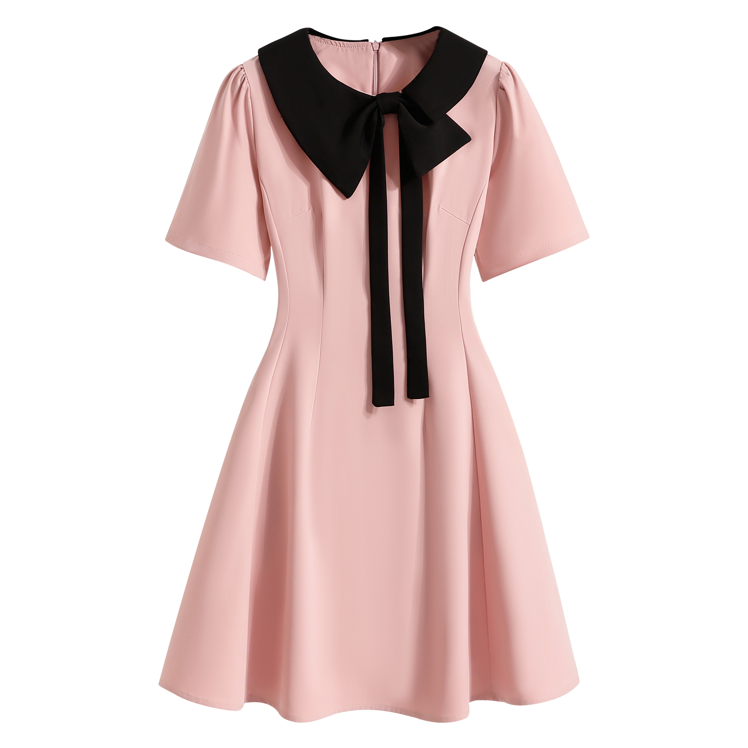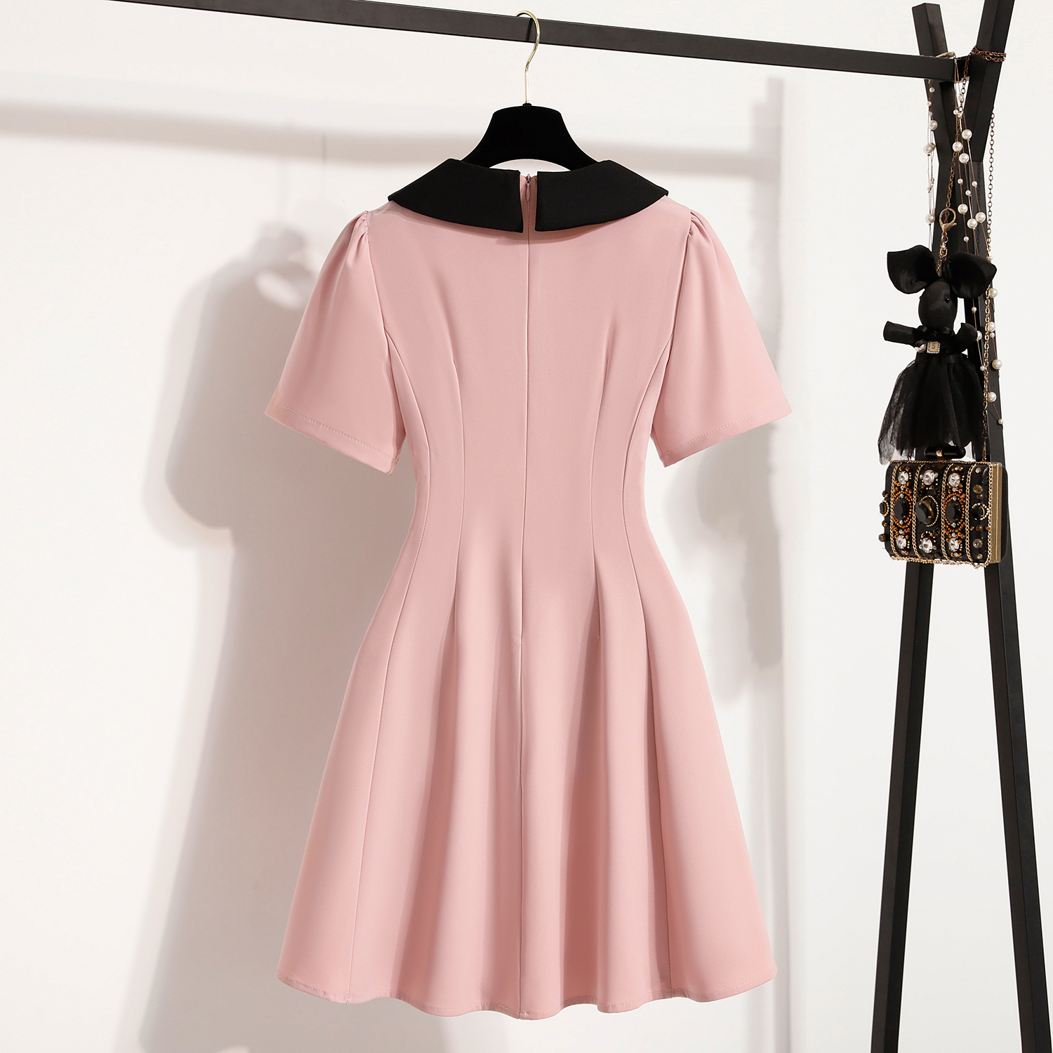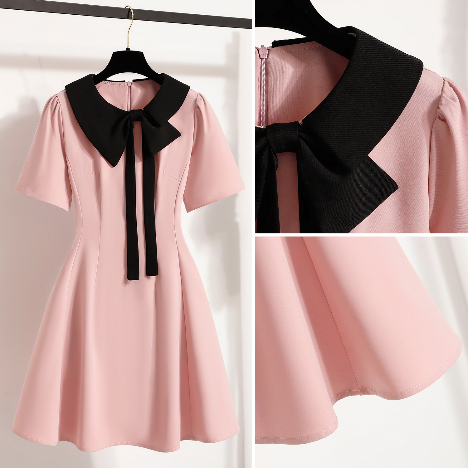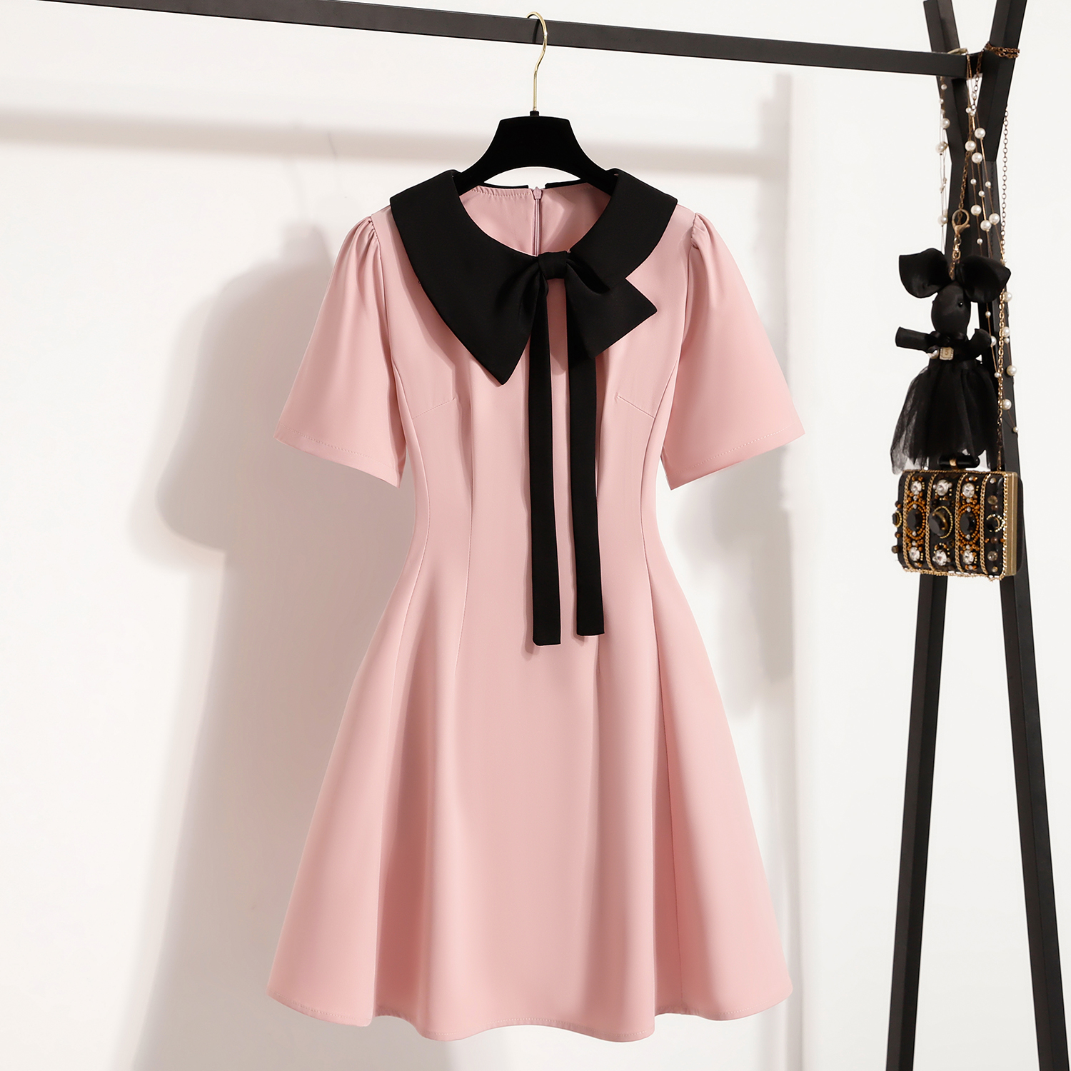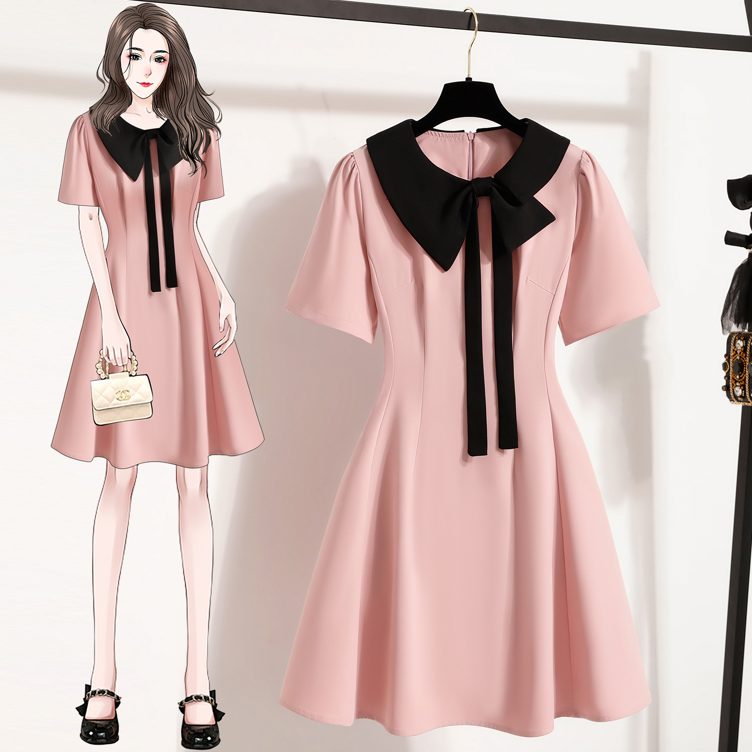 BY11922# 大码女装夏季新款粉色连衣裙胖mm黑色拼接显瘦显瘦连衣裙 服裝批發女裝批發服飾貨源