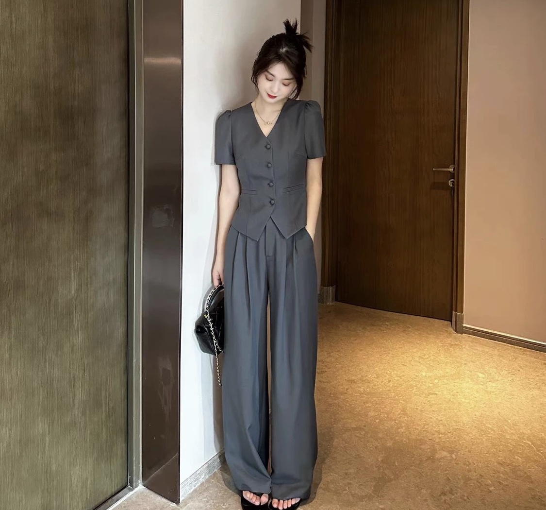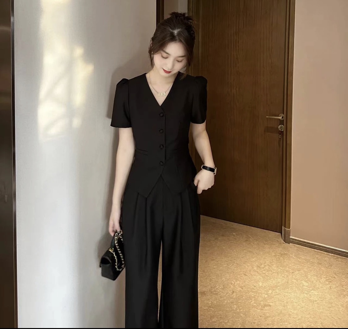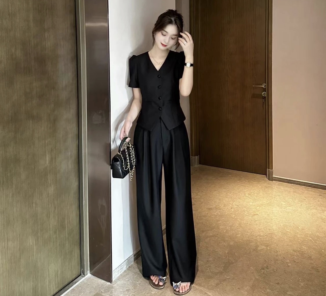 小香风气质职业套装新款百搭显瘦短袖上衣休闲阔腿裤两件套 服裝批發女裝批發服飾貨源