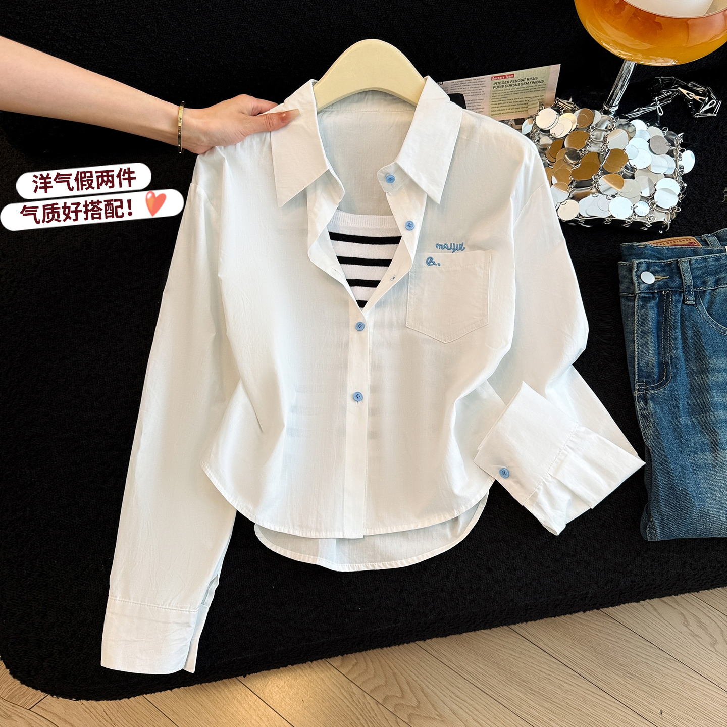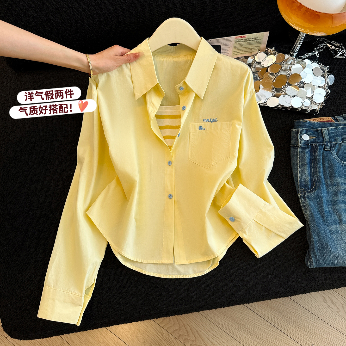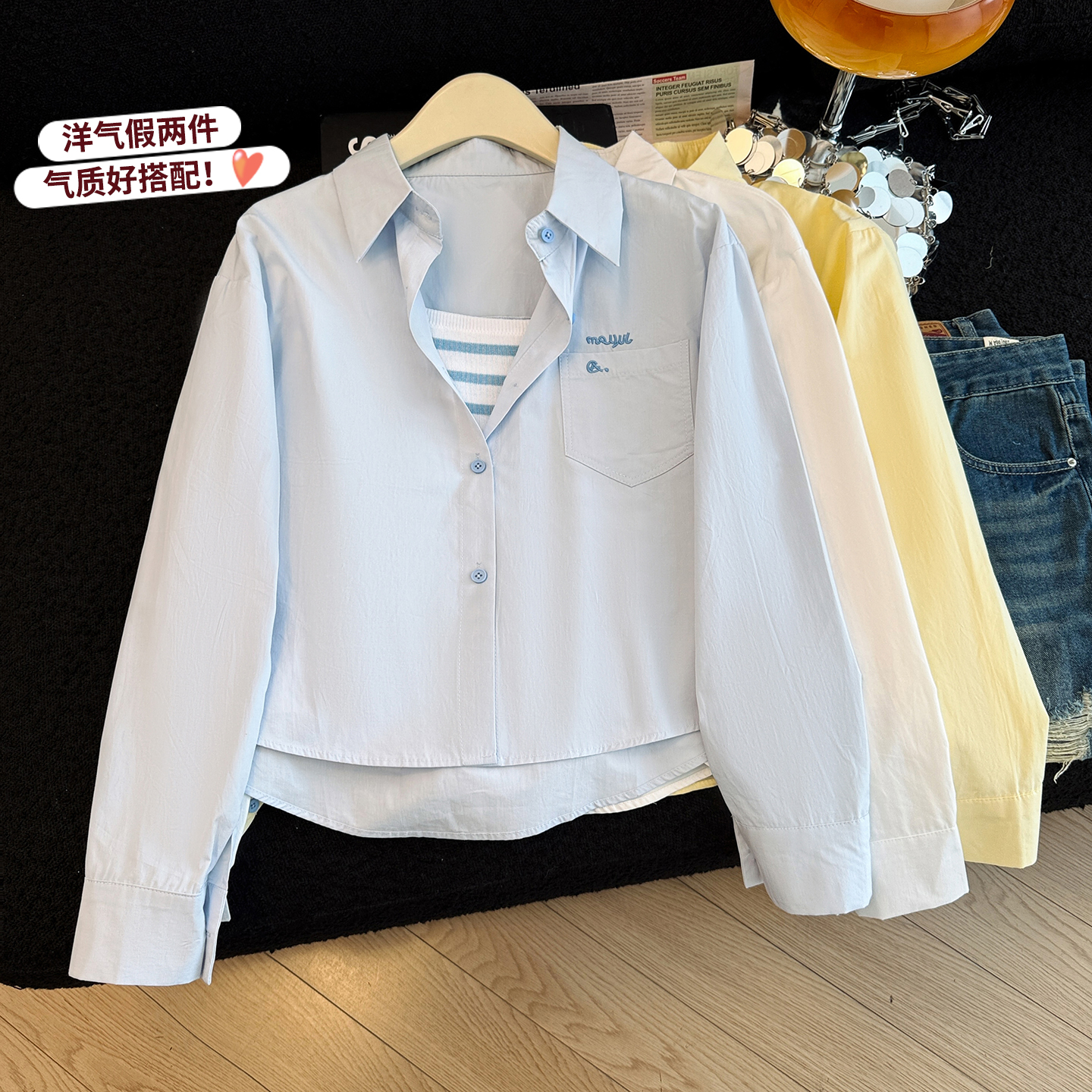 爆款设计感条纹内搭女春季糖果色宽松显瘦百搭两件套衬衣背心 服裝批發女裝批發服飾貨源
