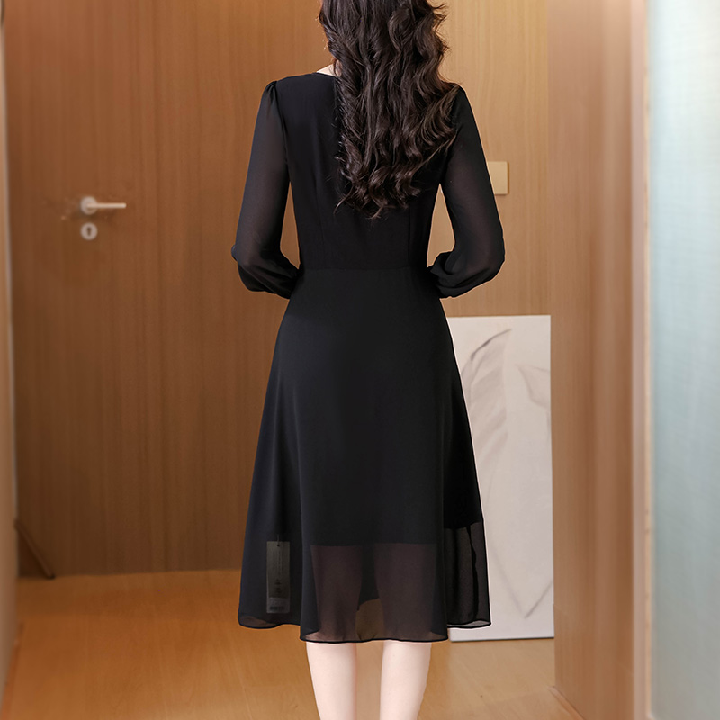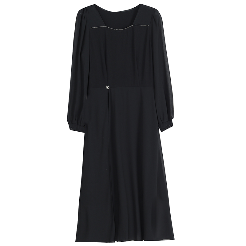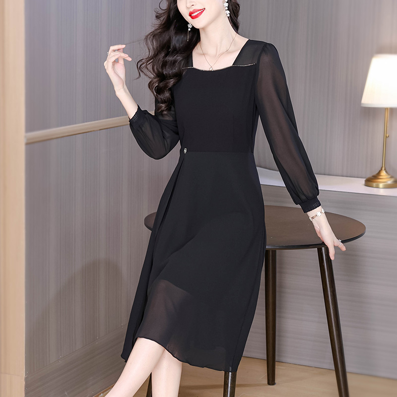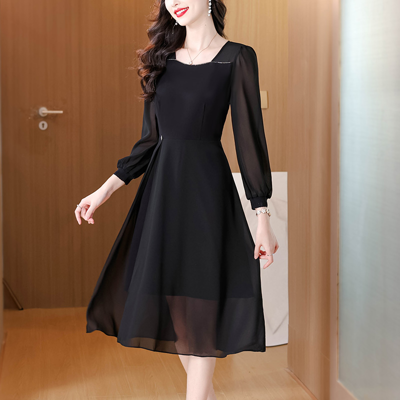 时尚黑色方领雪纺垂坠感连衣裙女秋季新款长袖中长裙子 服裝批發女裝批發服飾貨源