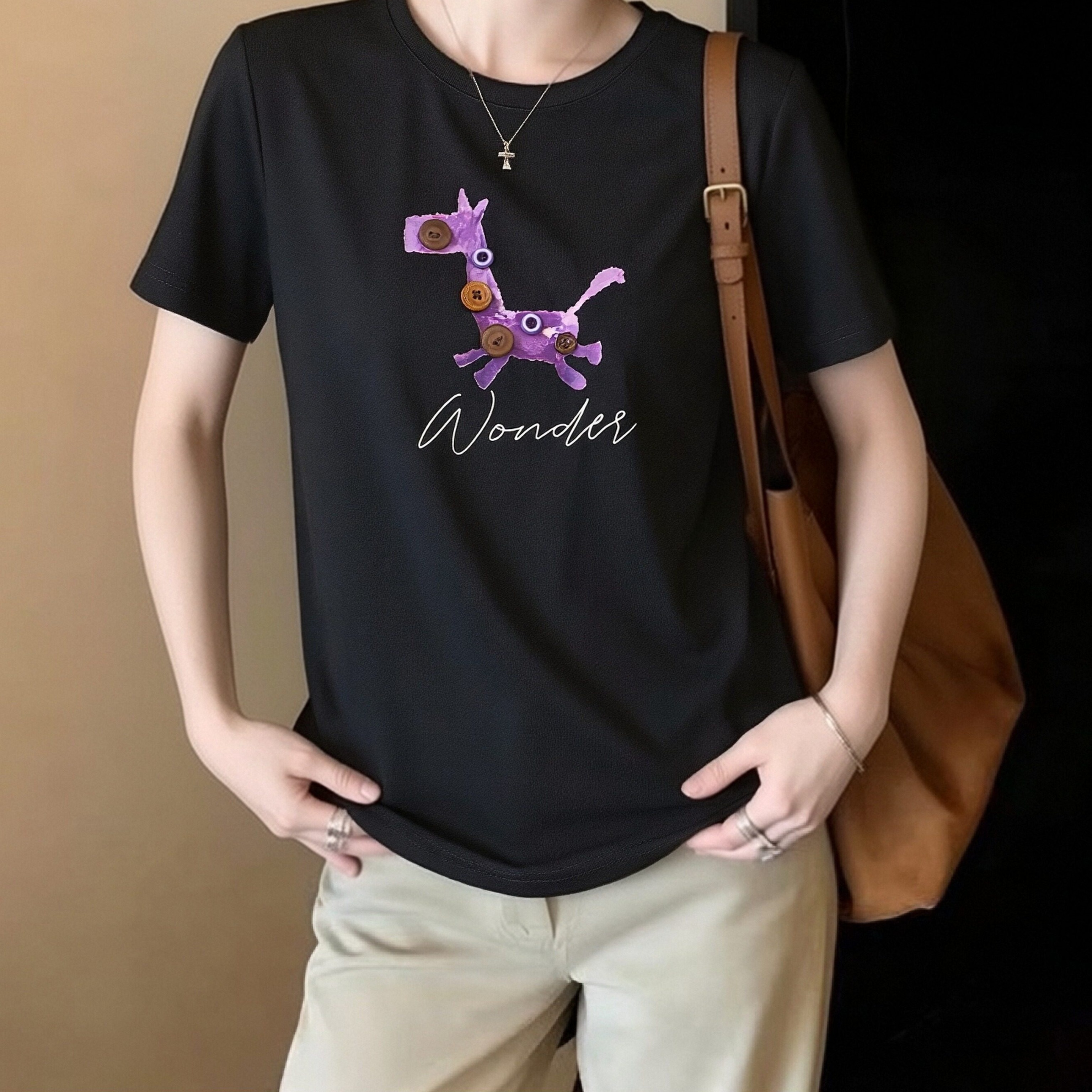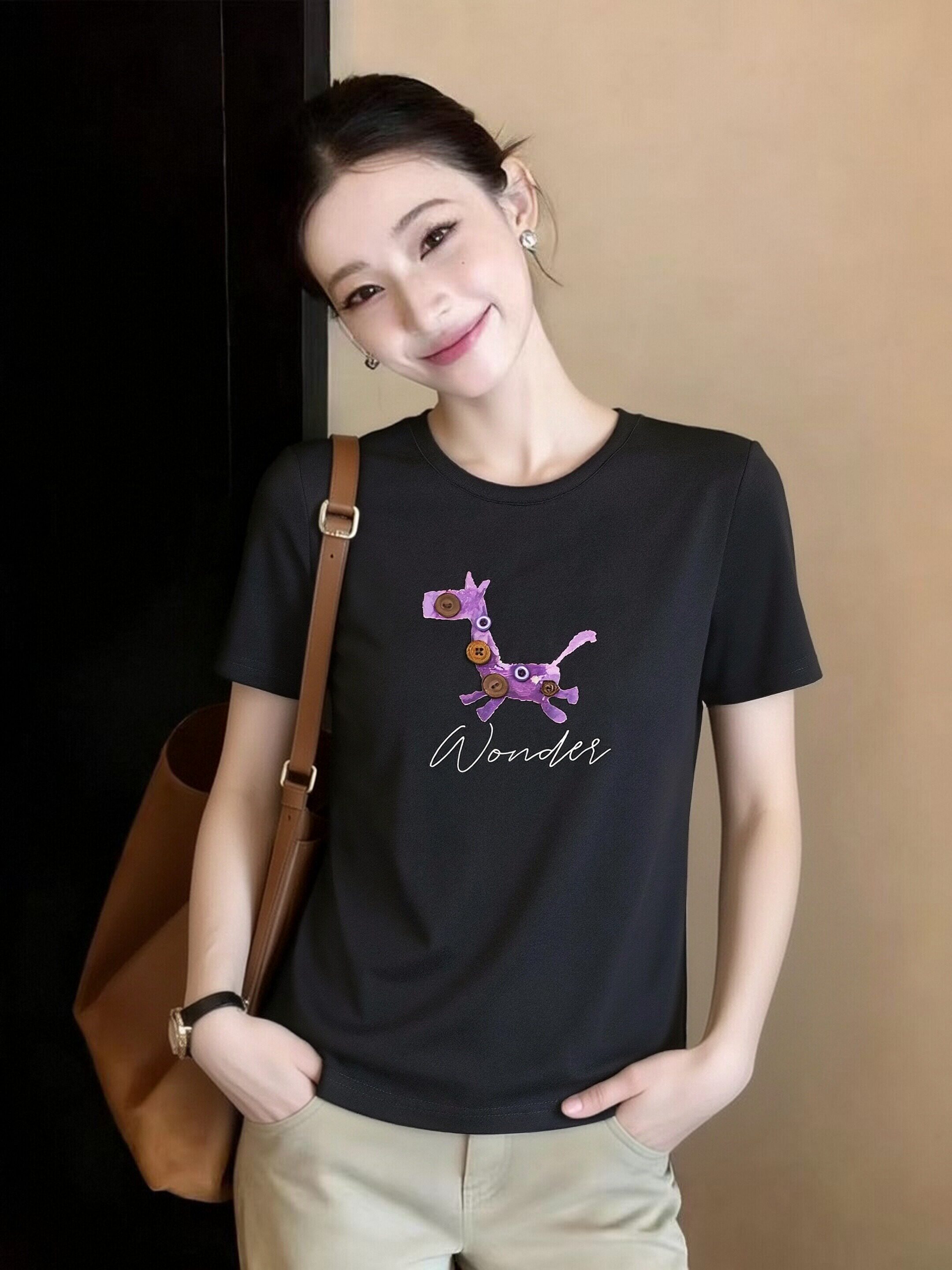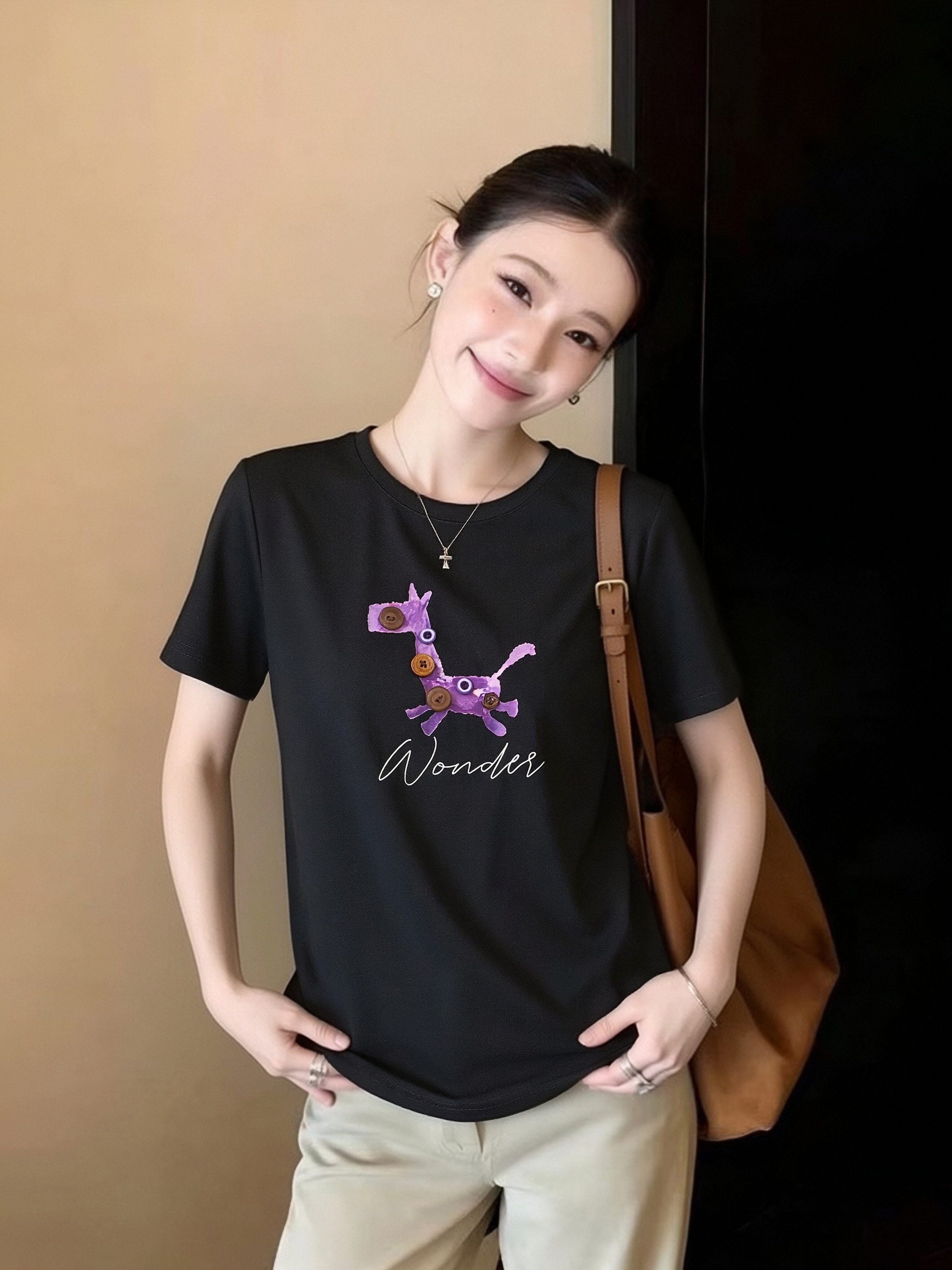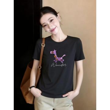 黑色圆领短袖T恤衫女夏季新款百搭休闲宽松半袖体恤上衣 服裝批發女裝批發服飾貨源
