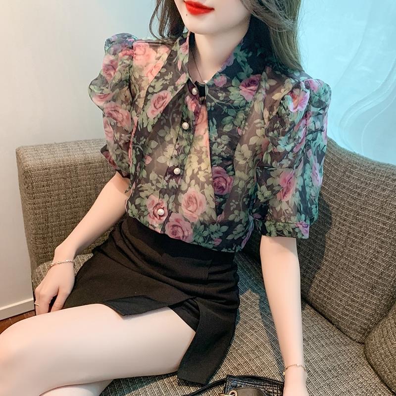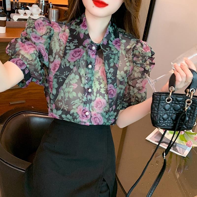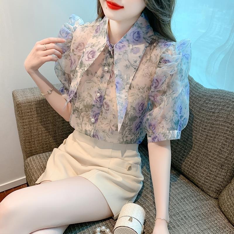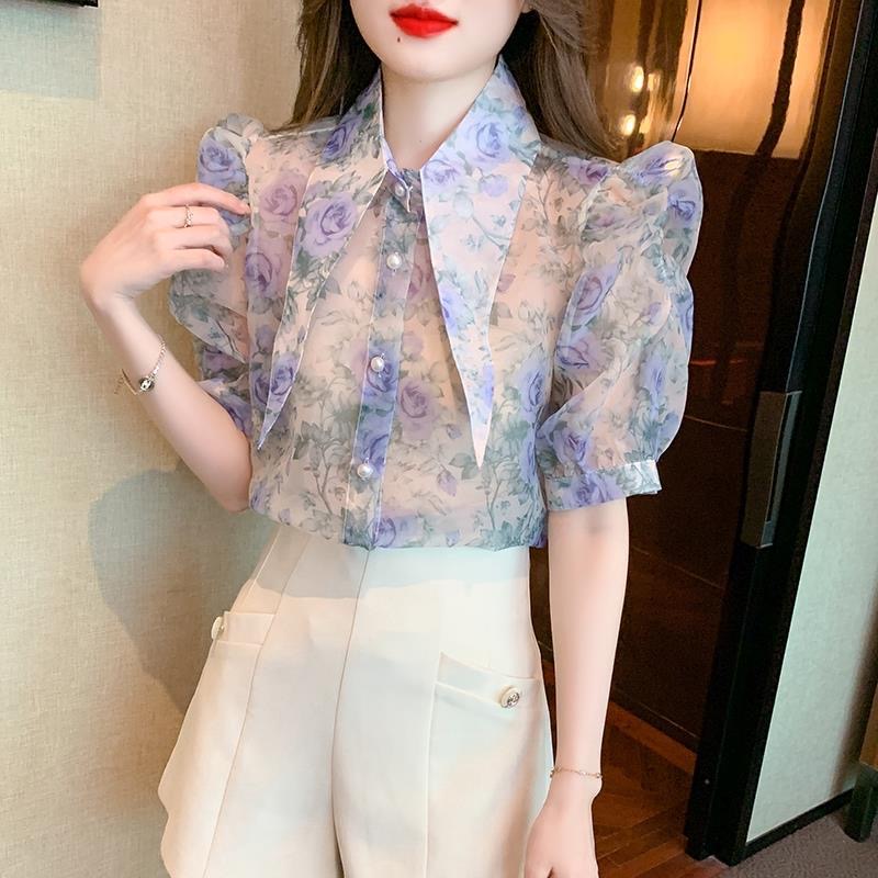 BY12519# 夏季新款短袖印花雪纺衫女士大码遮肚子百搭小衫女 服裝批發女裝批發服飾貨源