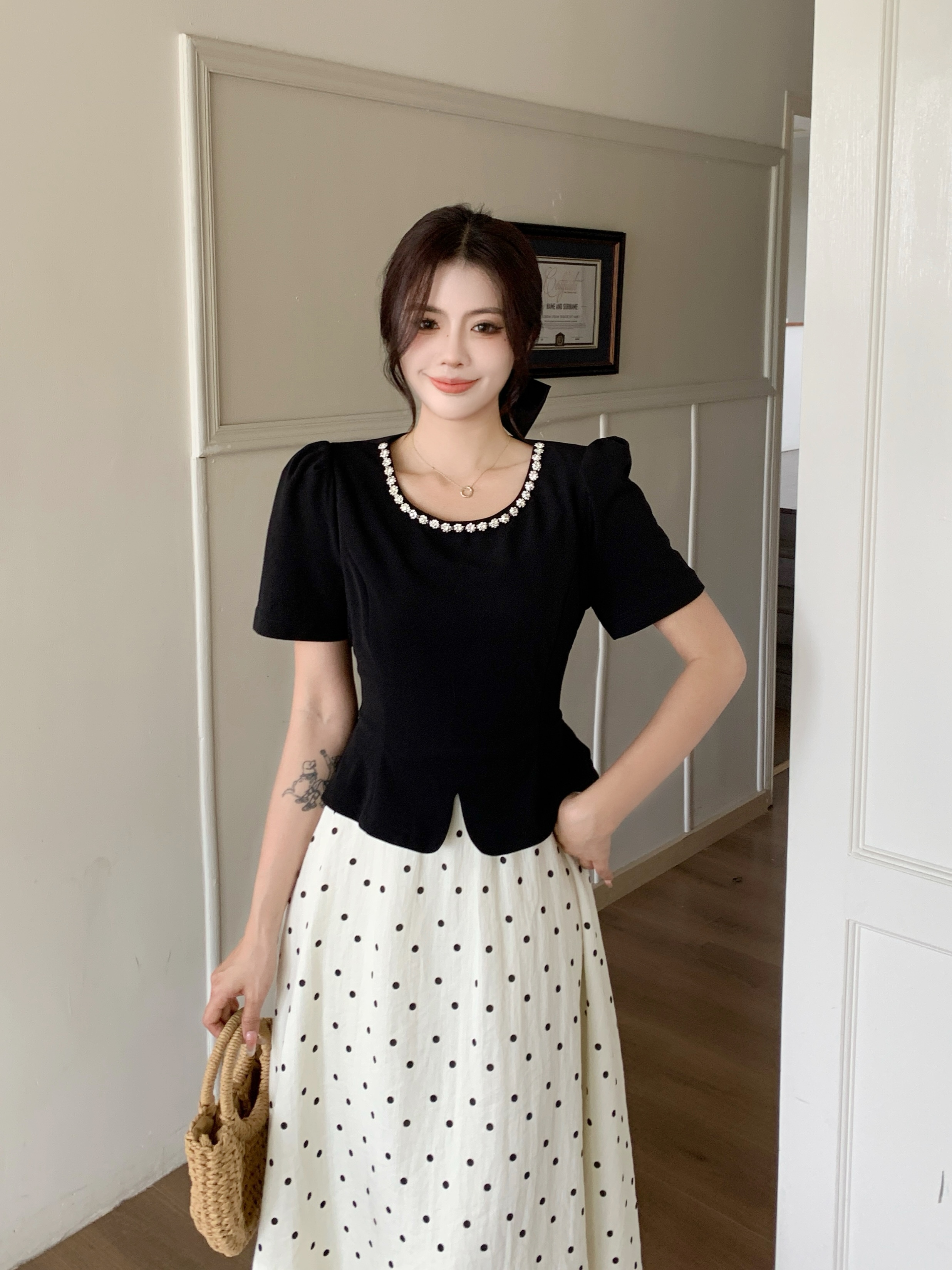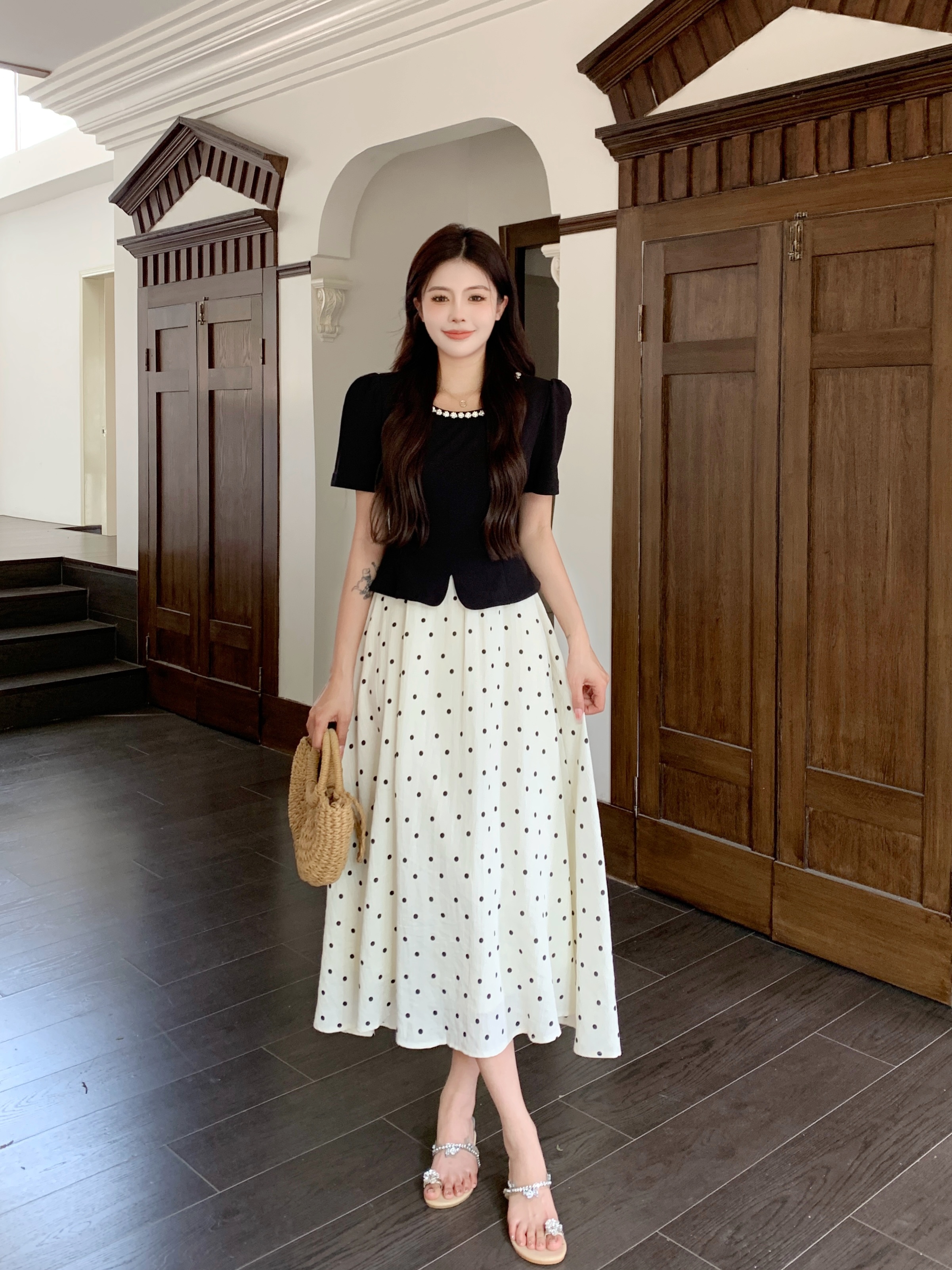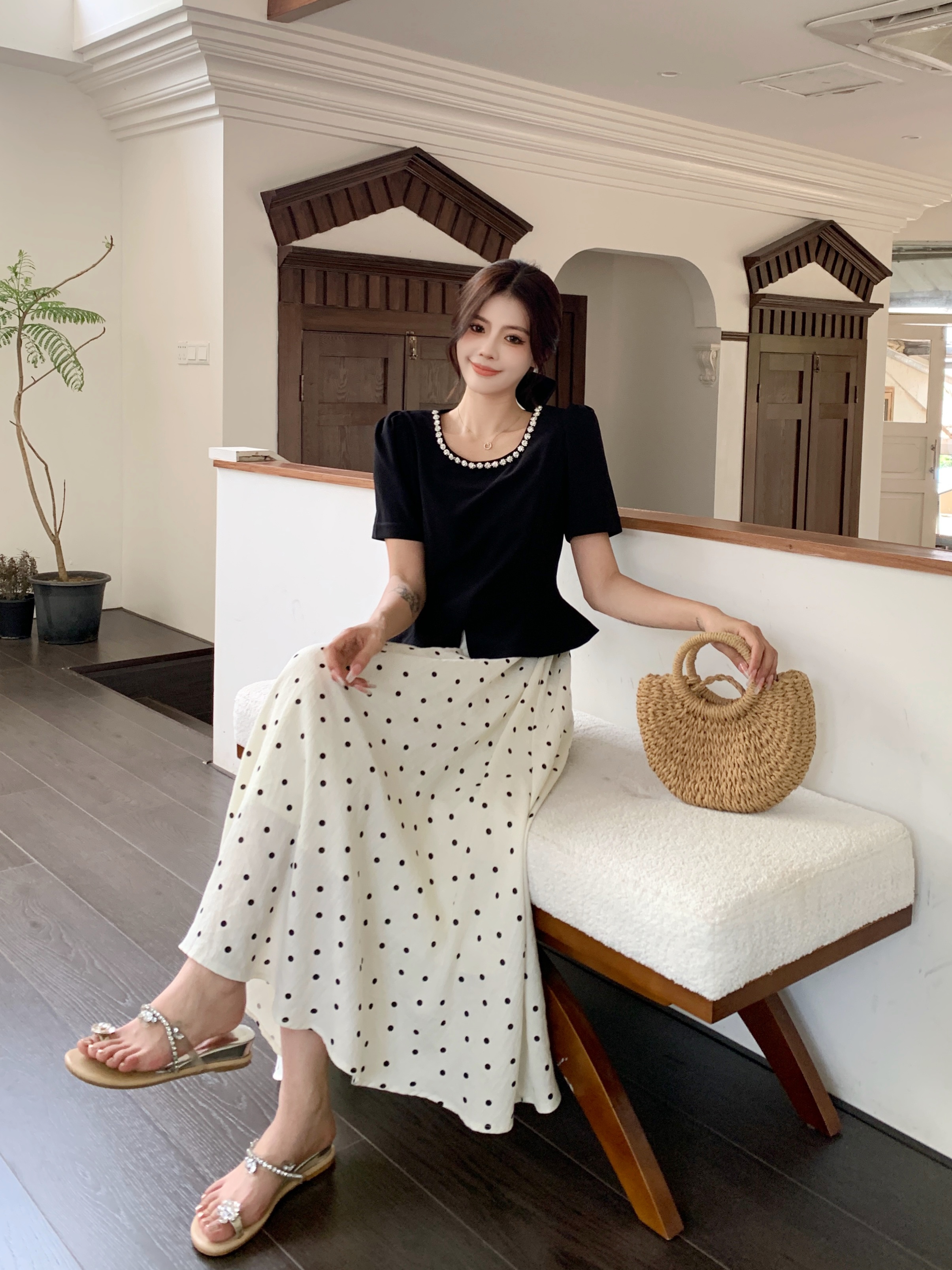 BY12548# 法式赫本风短袖连衣裙女夏季大码女装收腰显瘦假两件波点长裙