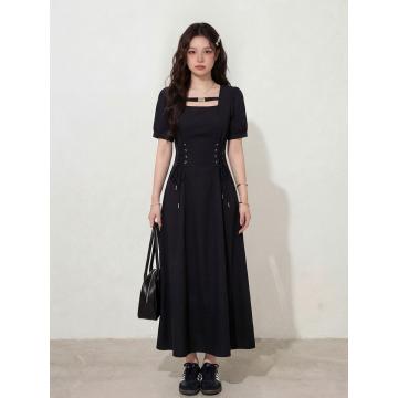 BY12660# 大码女装法式短袖连衣裙女夏季胖MM收腰显瘦黑色牛仔连衣裙 服裝批發女裝批發服飾貨源