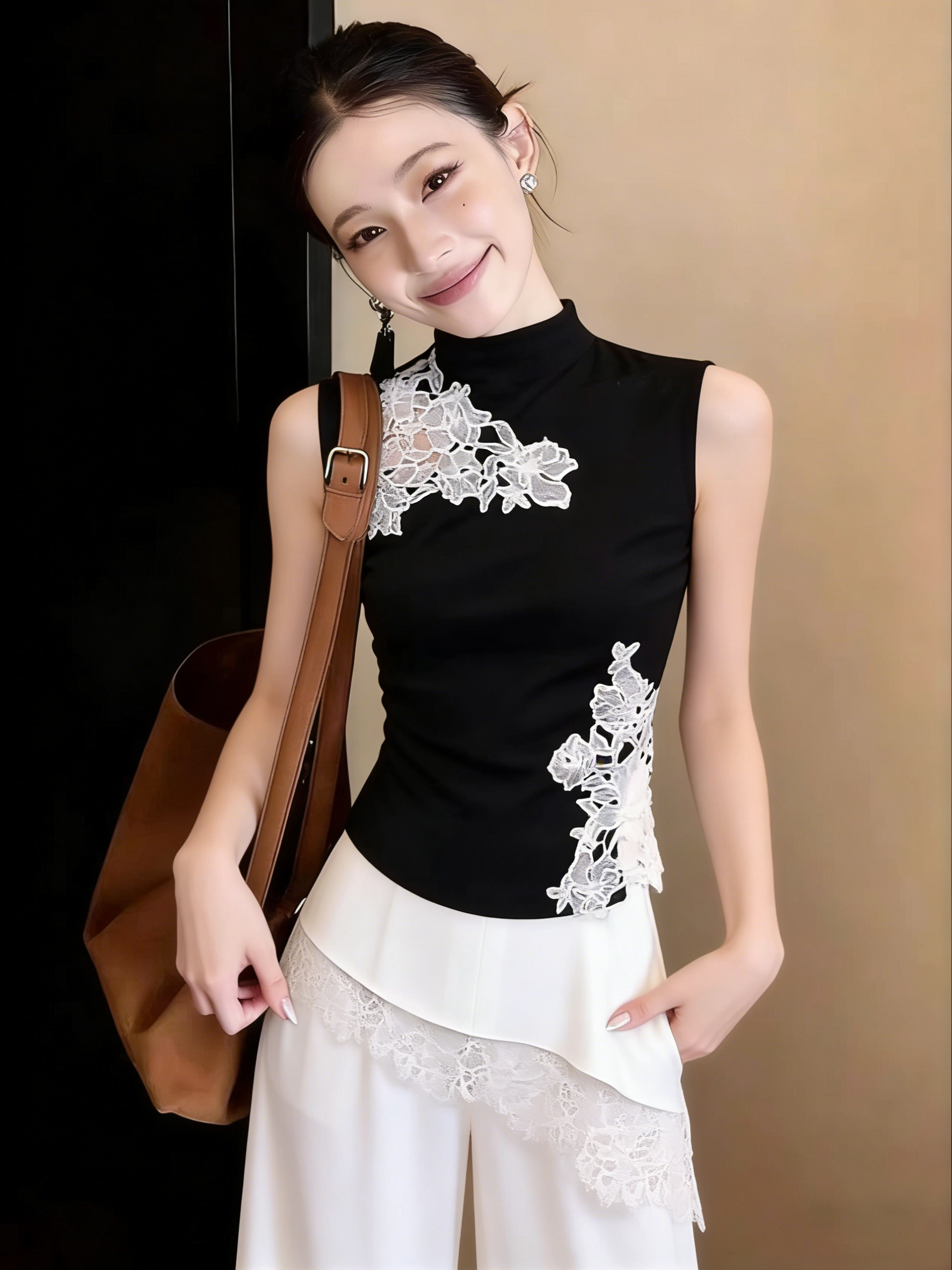 BY12779# 春夏绣花蕾丝拼接背心女镂空修身无袖内搭上衣 服裝批發女裝批發服飾貨源