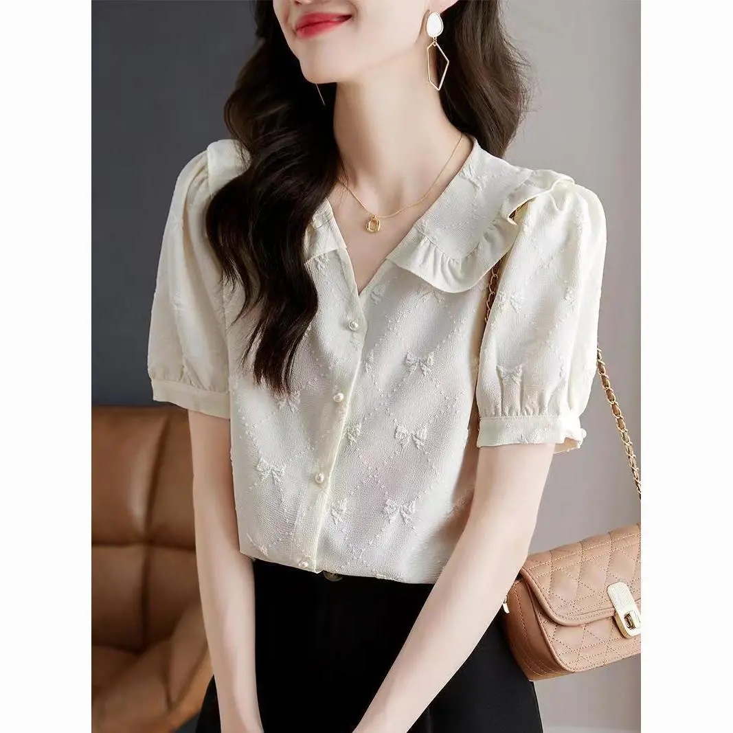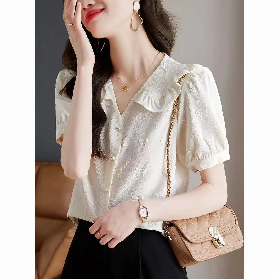 BY12860# 高档法式绣花雪纺衬衫女夏新洋气木耳边娃娃领短袖清爽潮上衣 服裝批發女裝批發服飾貨源