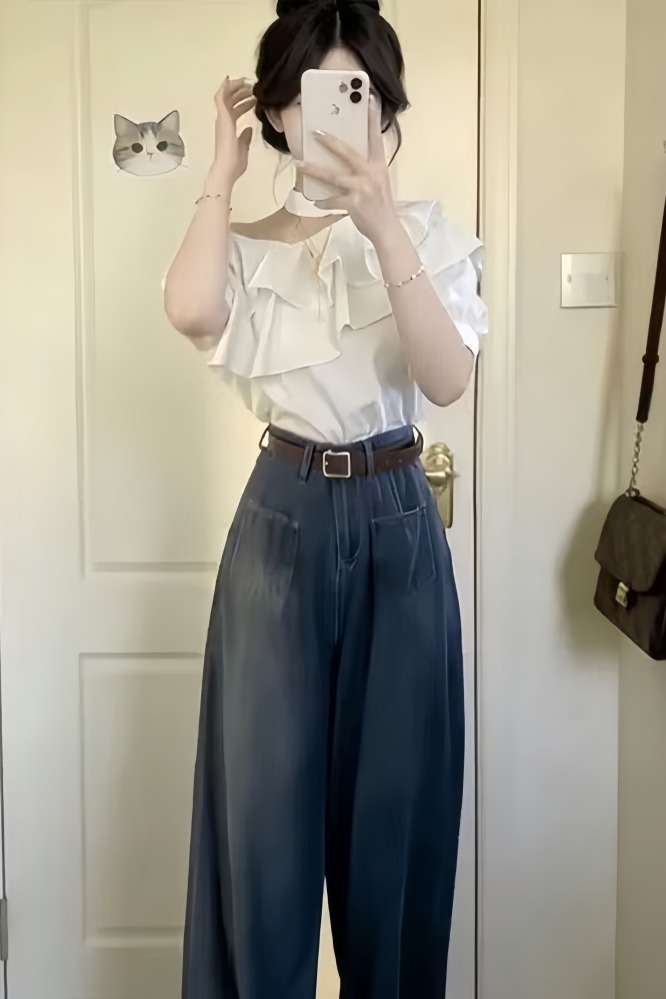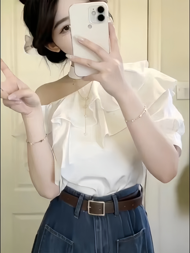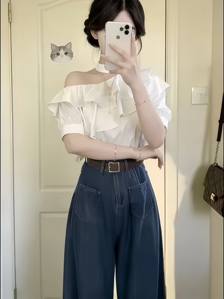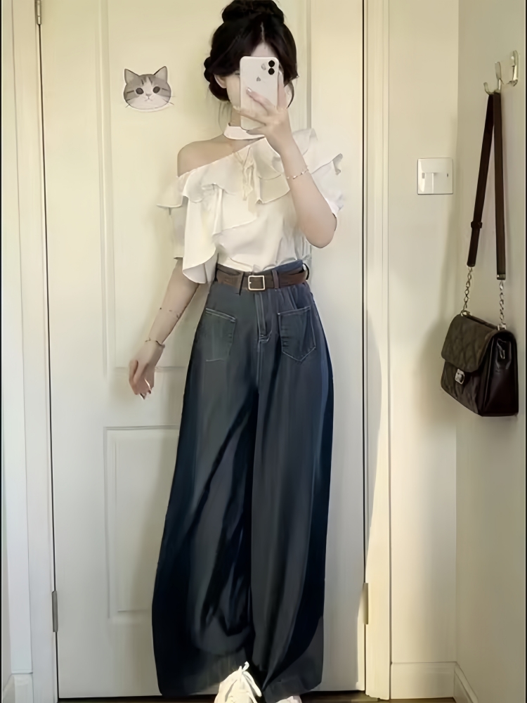 BY12934# 韩系一整套ootd穿搭露肩荷叶边上衣高腰阔腿裤女夏两件套显瘦套装 服裝批發女裝批發服飾貨源
