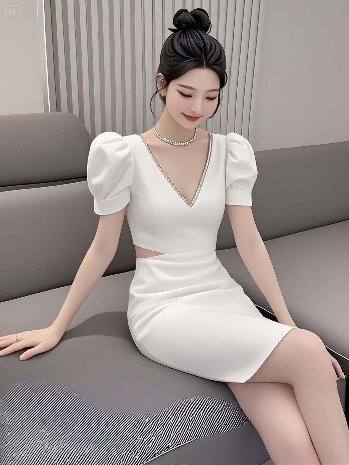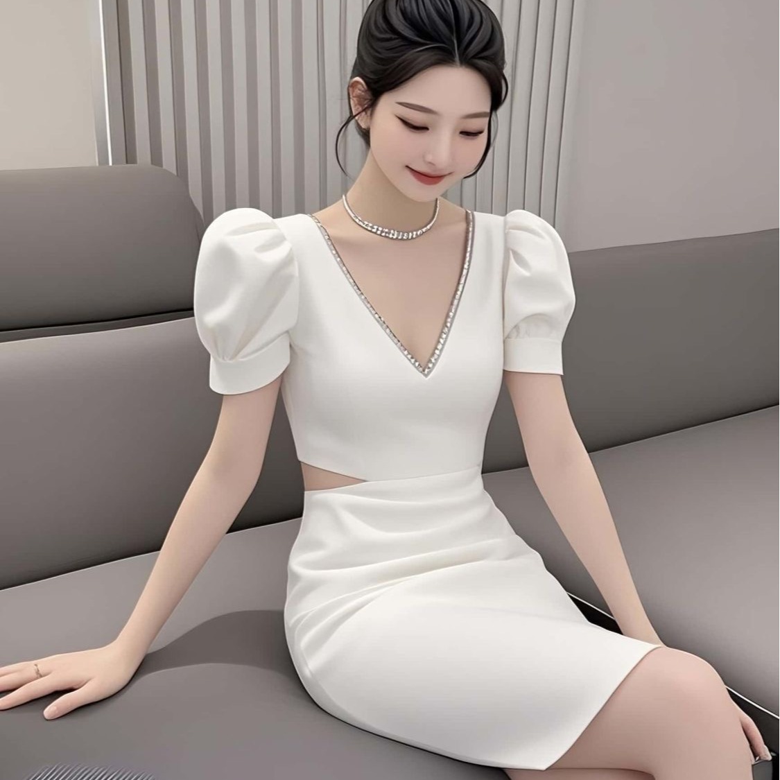 BY13001# 高级感夏季法式性感镂空钉珠V领泡泡袖连衣裙显瘦修身短款包臀裙 服裝批發女裝批發服飾貨源