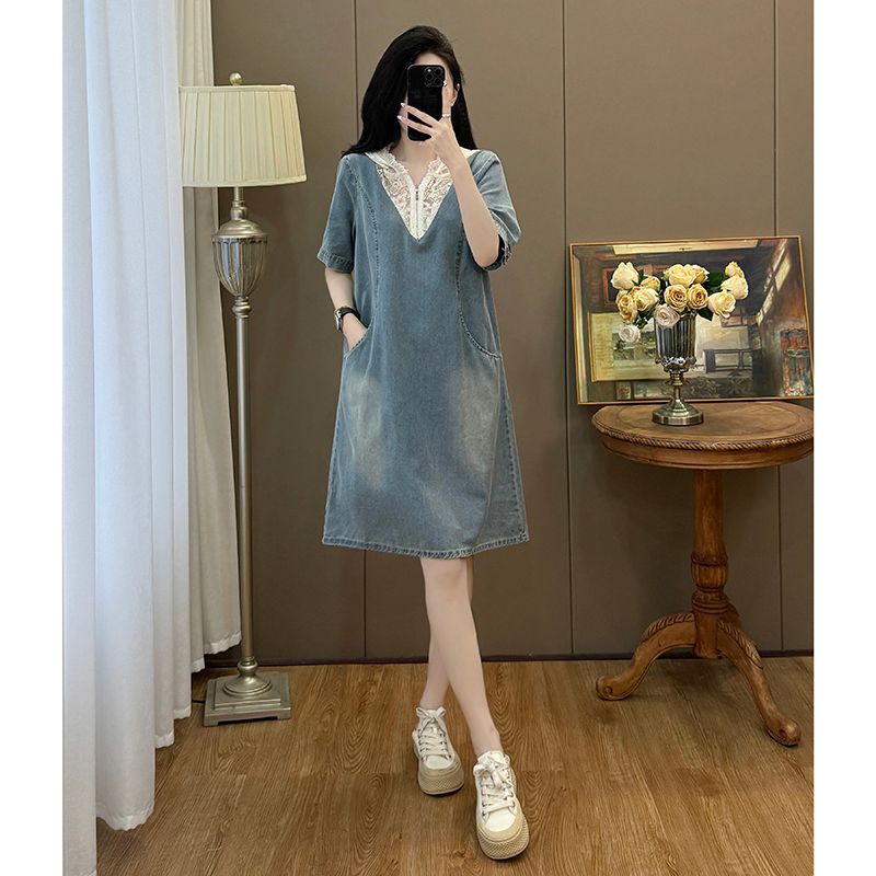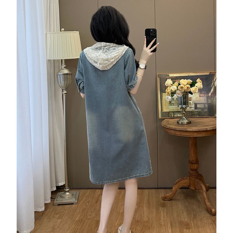 Home > 短袖连衣裙、夜店装 > BY13385# 蕾丝拼接连帽连衣裙女夏季新款欧货大码裙子气质牛仔裙 服裝批發女裝批發服飾貨源