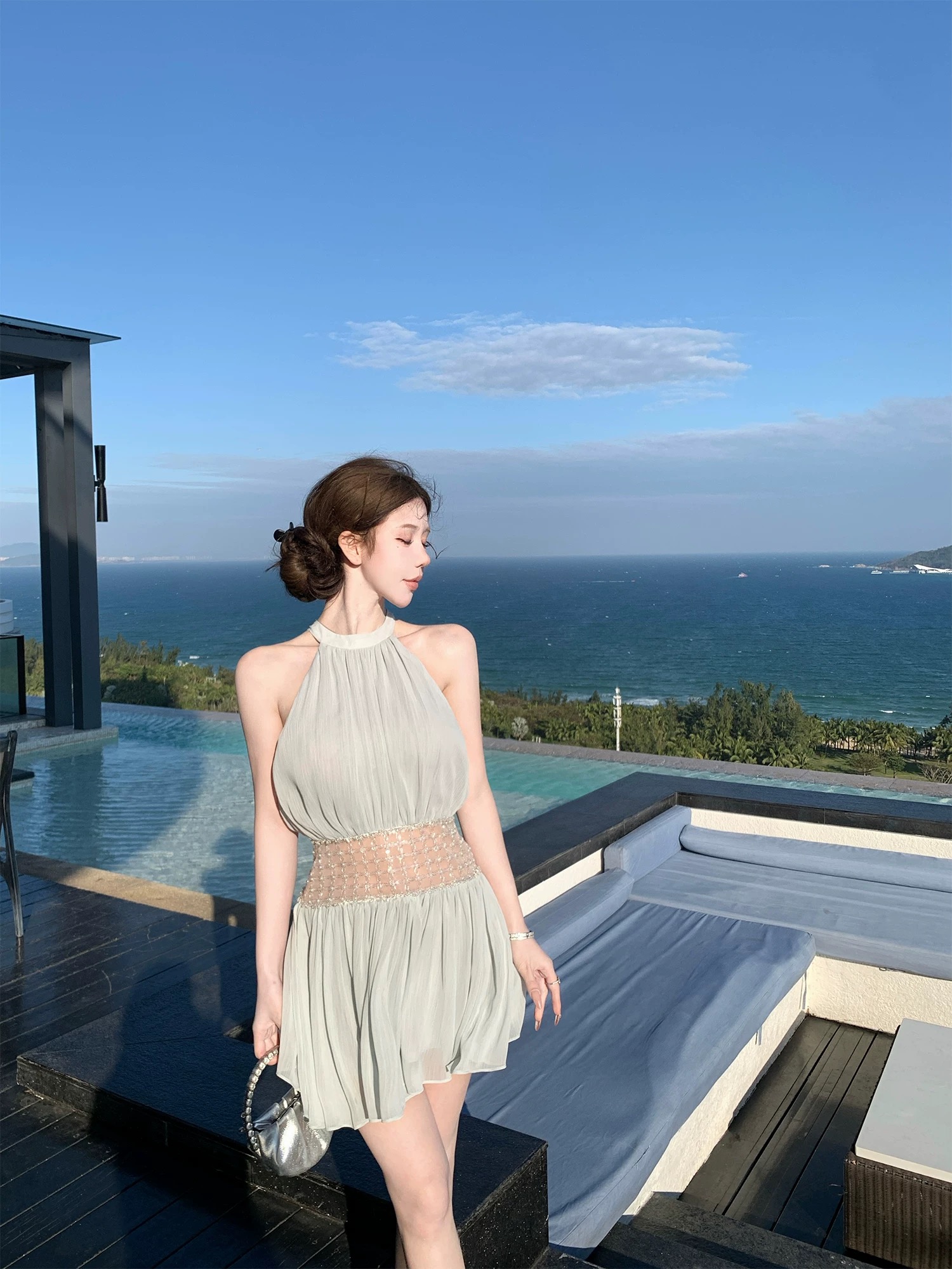 BY13398# kubiliv海蓝碎珀重工挂脖挖肩纯欲氛围感手工钉珠收腰连衣裙 服裝批發女裝批發服飾貨源