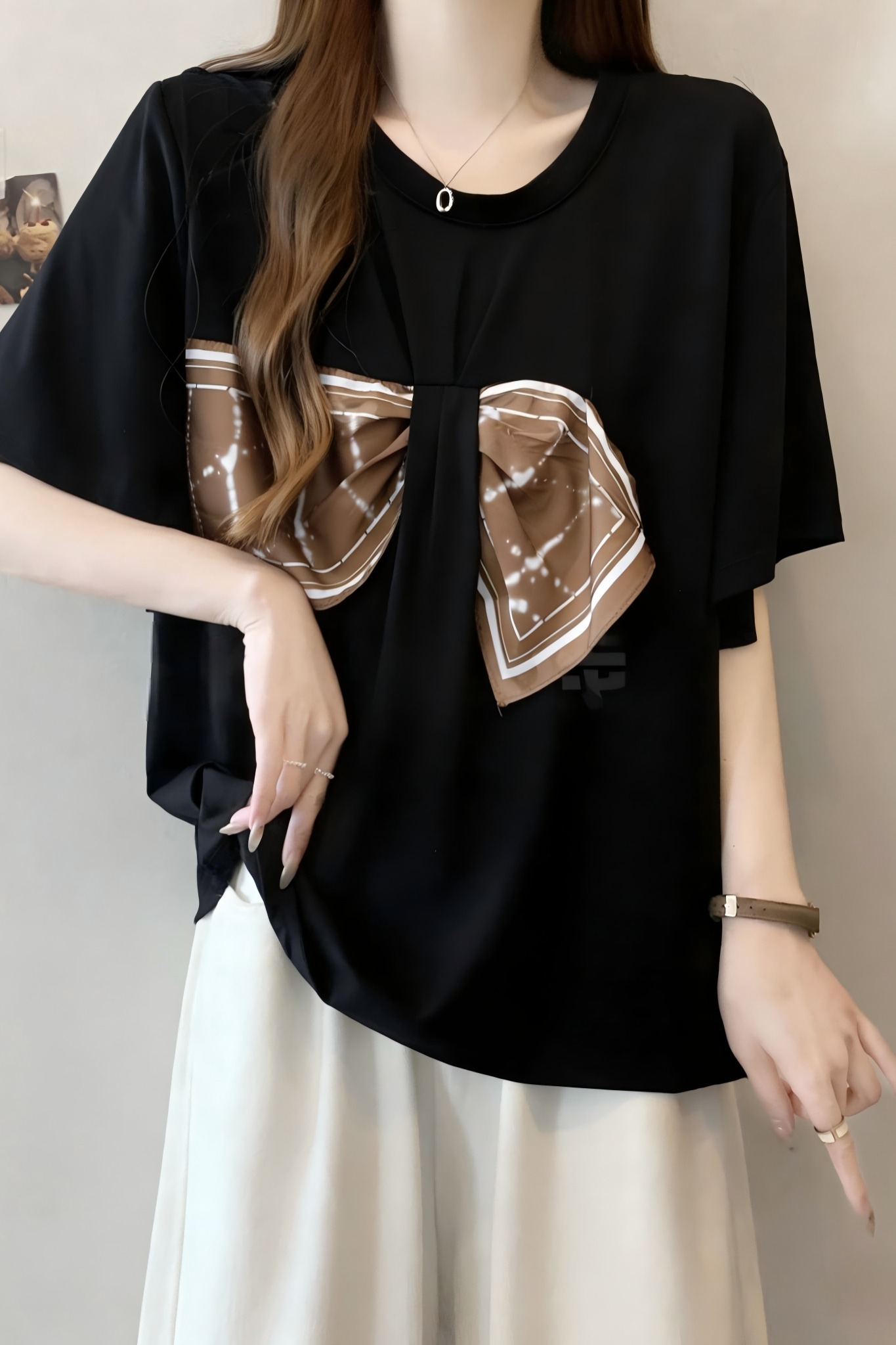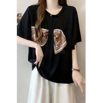BY13436# 大码女装夏季新款设计感显瘦宽松拼接蝴蝶结丝巾假两件T 服裝批發女裝批發服飾貨源