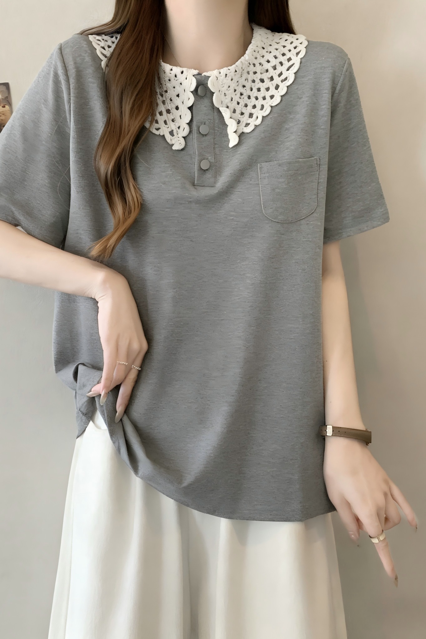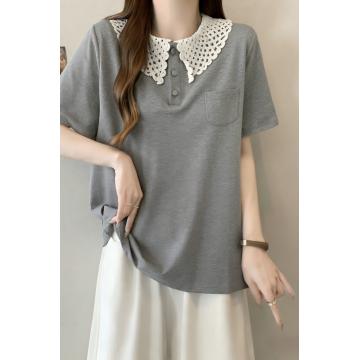 BY13437# 大码女装夏新款小众设计感休闲百搭拼色娃娃领短袖宽松t 服裝批發女裝批發服飾貨源