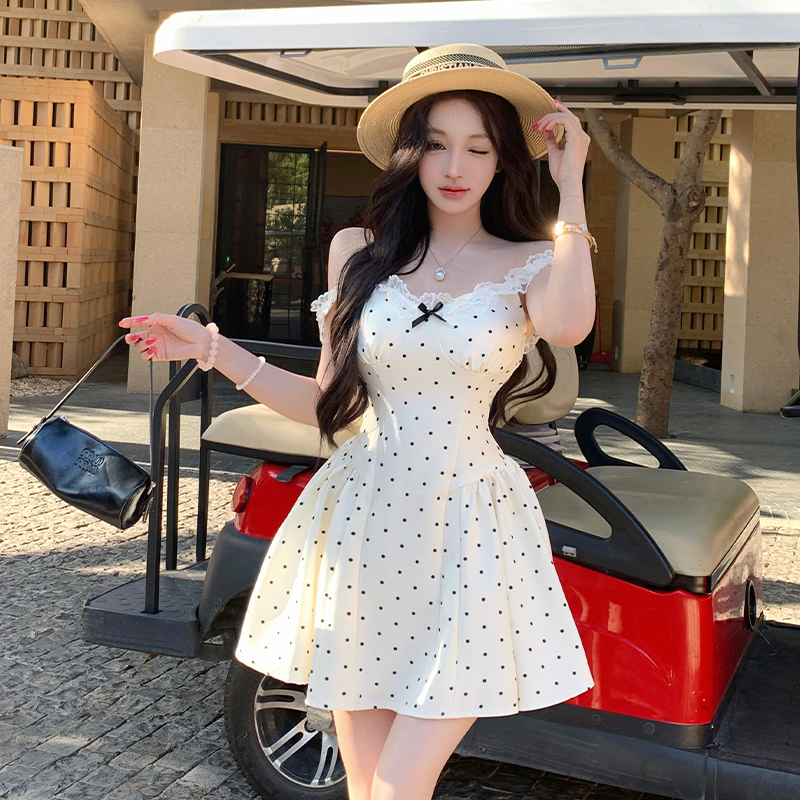 BY13438# 纯欲辣妹气质波点连衣裙女夏季新款蕾丝收腰显瘦蓬蓬短裙设计感潮 服裝批發女裝批發服飾貨源