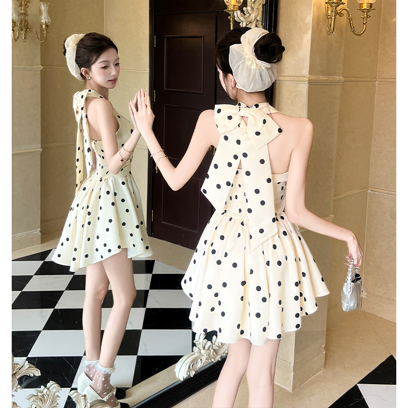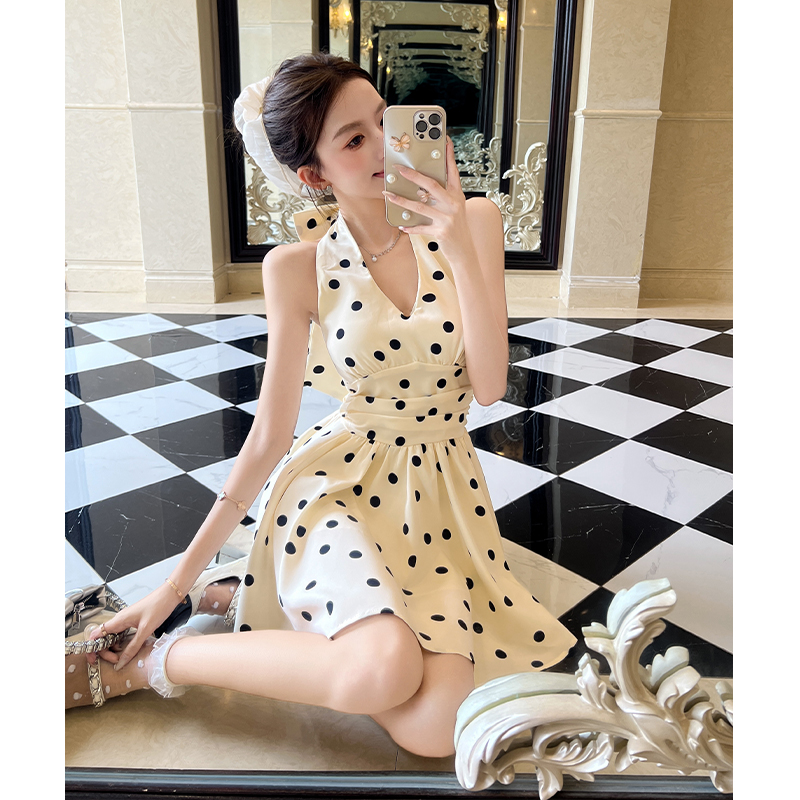 BY13440# 夏季新款法式气质波点挂脖连衣裙女带胸垫修身收腰a字短裙潮 服裝批發女裝批發服飾貨源