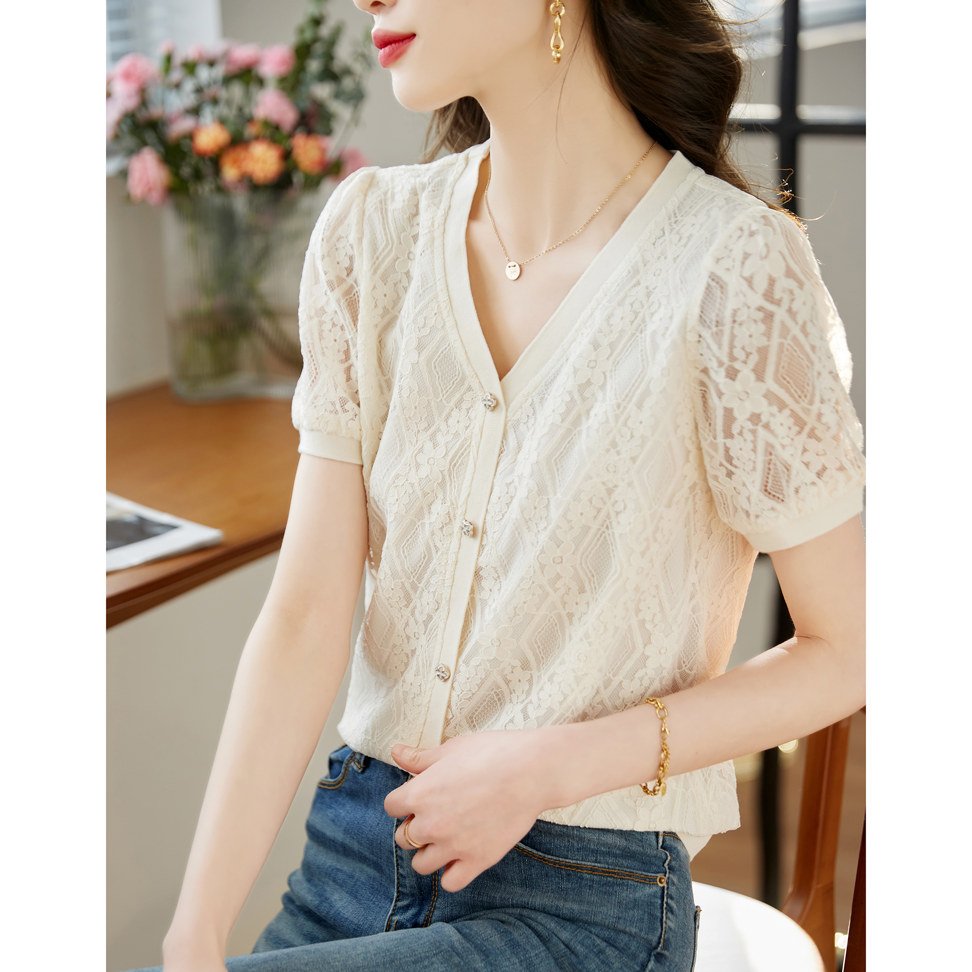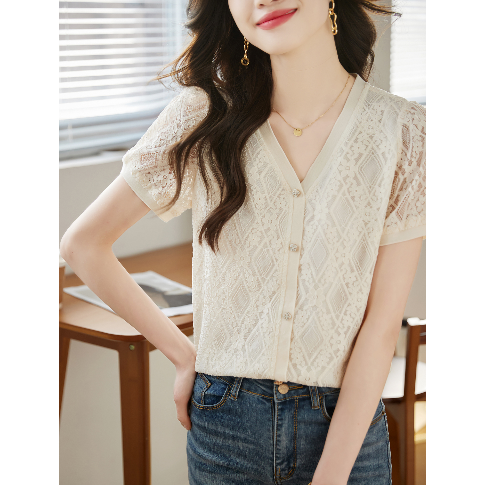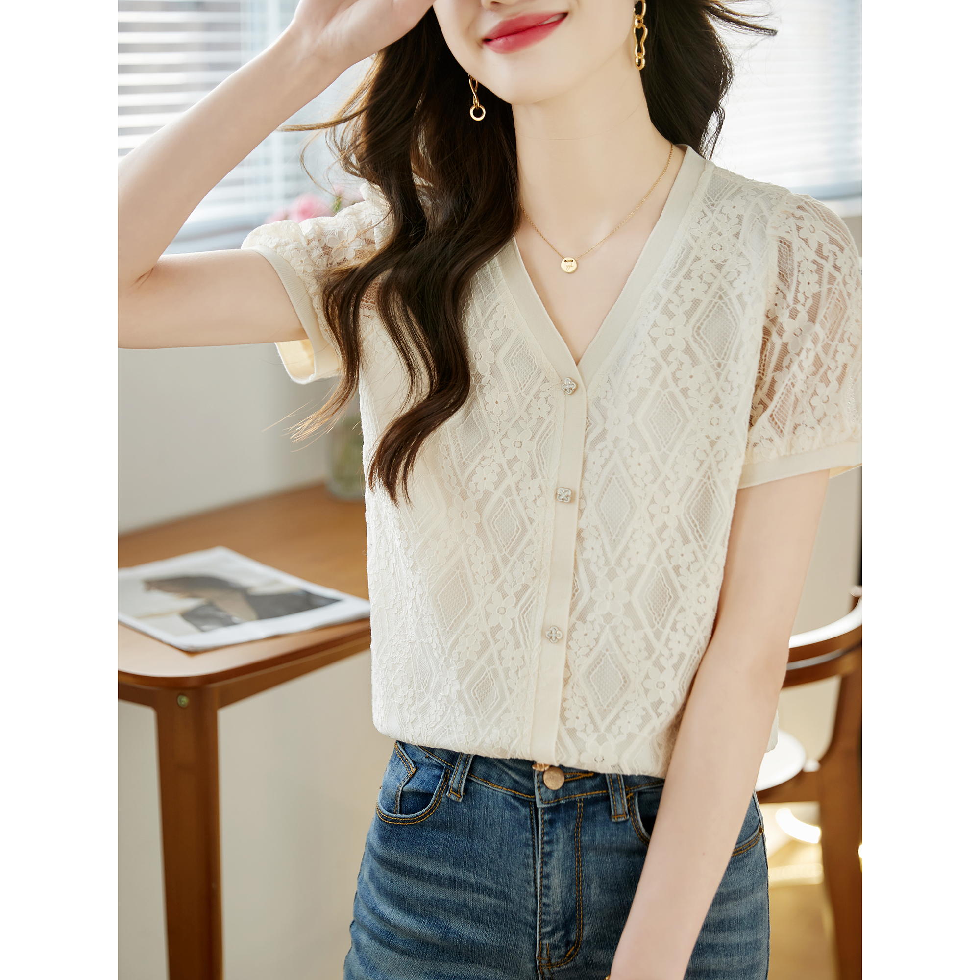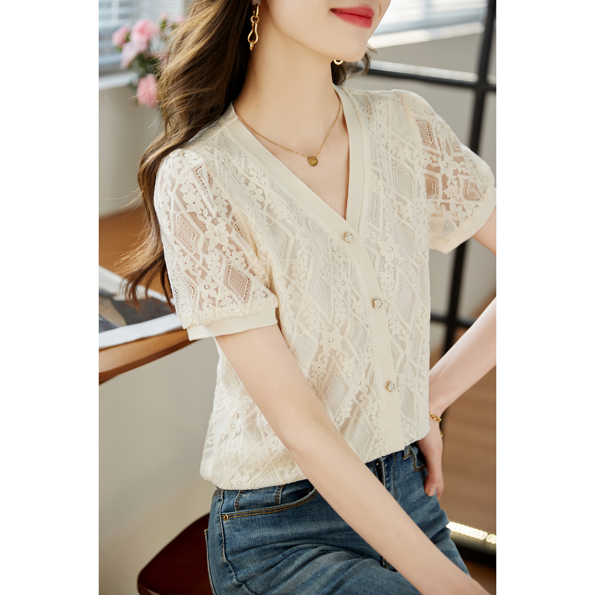 Home > 短袖雪纺衫、衬衫、上衣 > BY14453# 蕾丝上衣高级感夏款女士气质漂亮小衫时尚V领镂空上衣服裝批發女裝批發服飾貨源