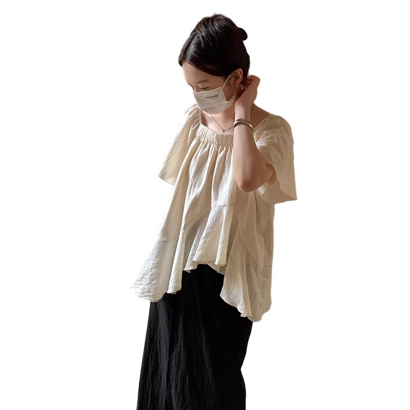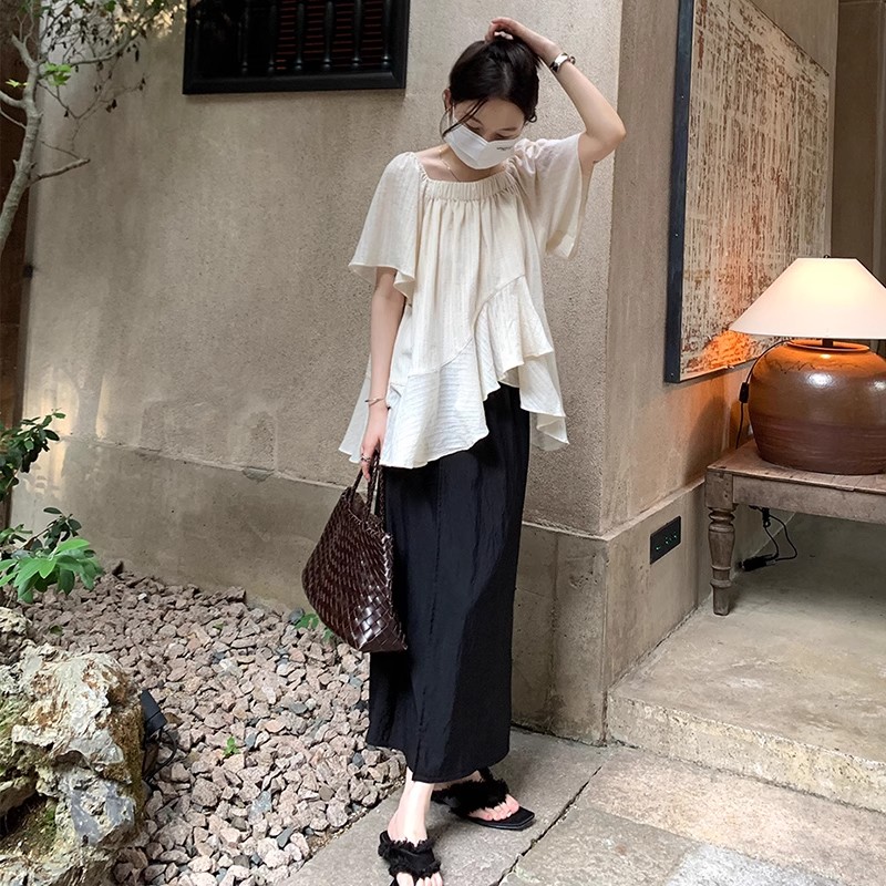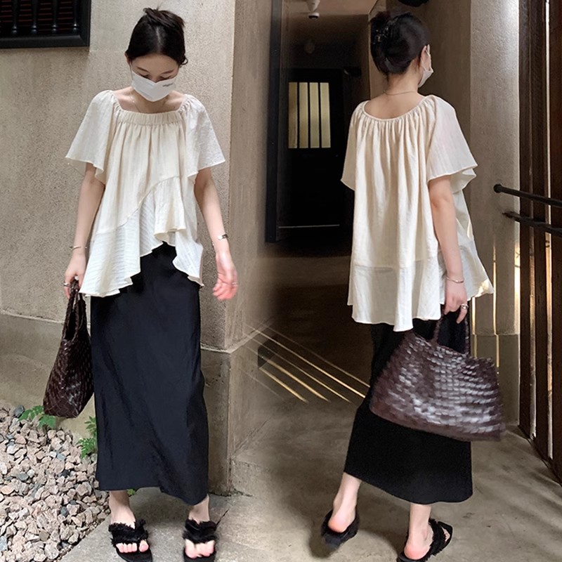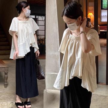 BY14469# 法式不规则超仙短袖雪纺衫夏微胖大码设计感遮肚子娃娃衫流行上衣服裝批發女裝批發服飾貨源