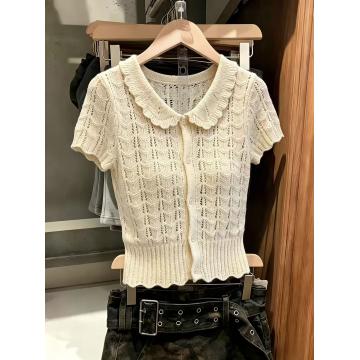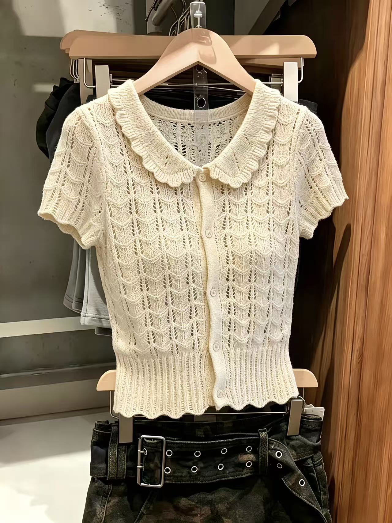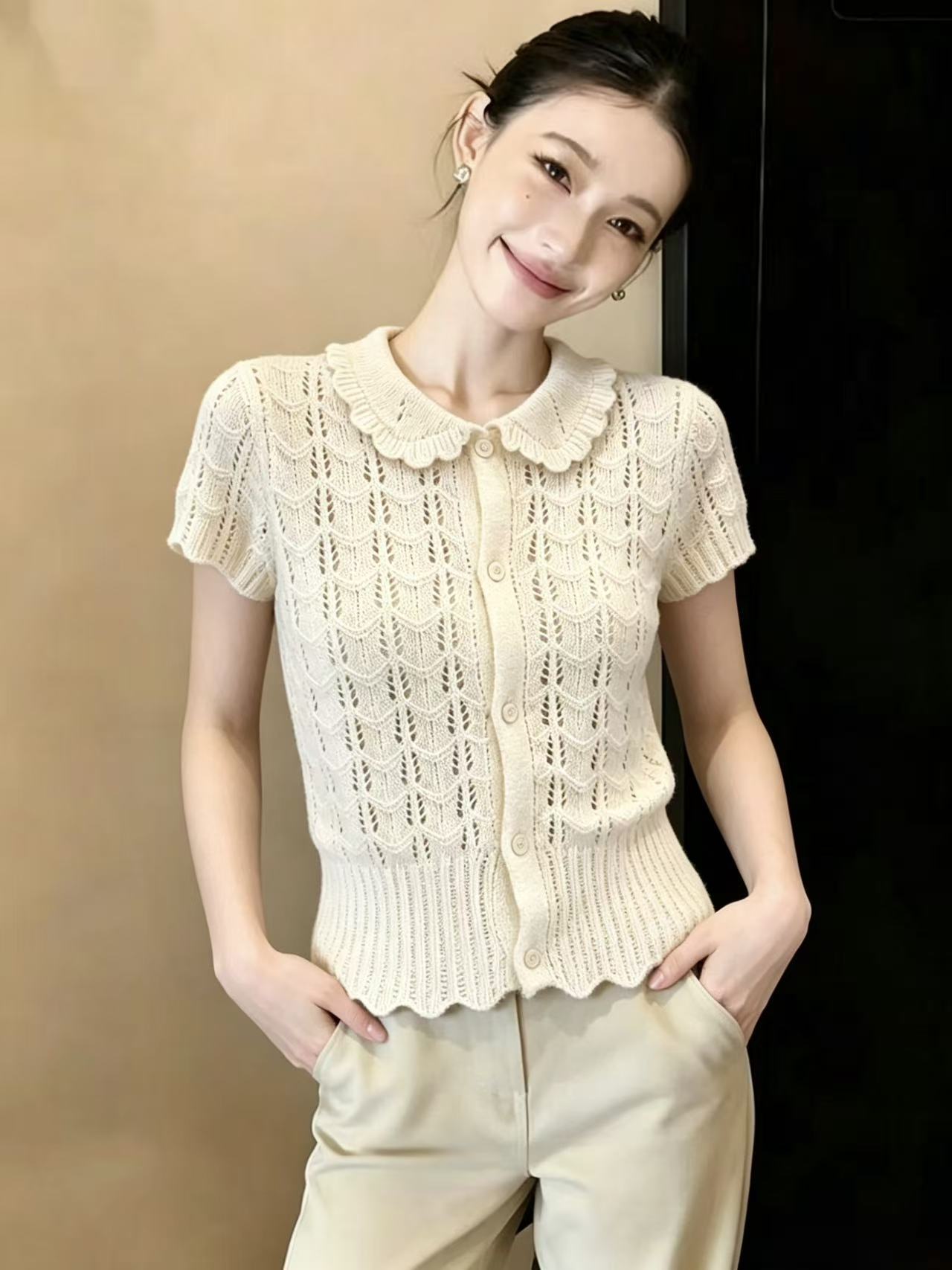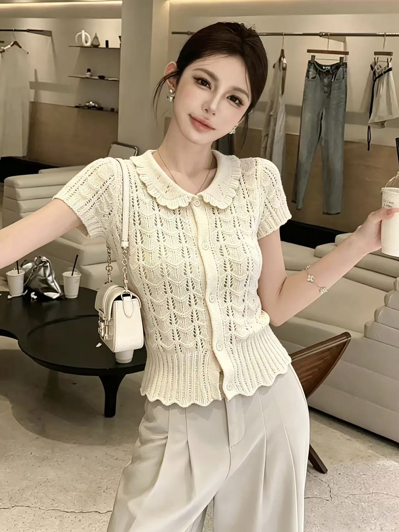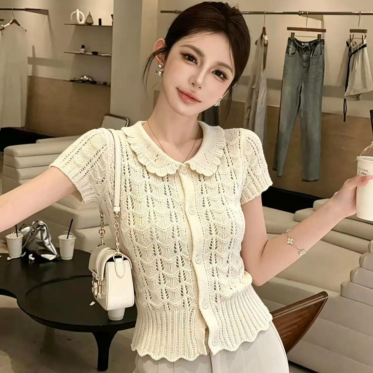 BY14854# 夏季新款小众设计感镂空针织开衫短袖娃娃领收腰气质上衣chic 服裝批發女裝批發服飾貨源