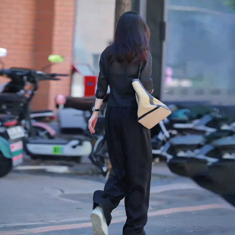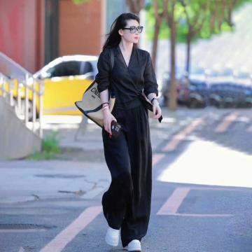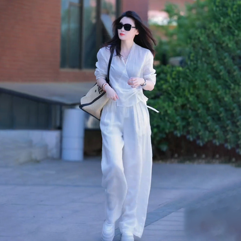BY14955# FA56876# 新款透气亚麻V领系带上衣+阔腿直筒裤显瘦两件套女夏