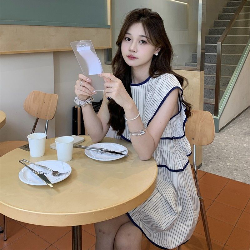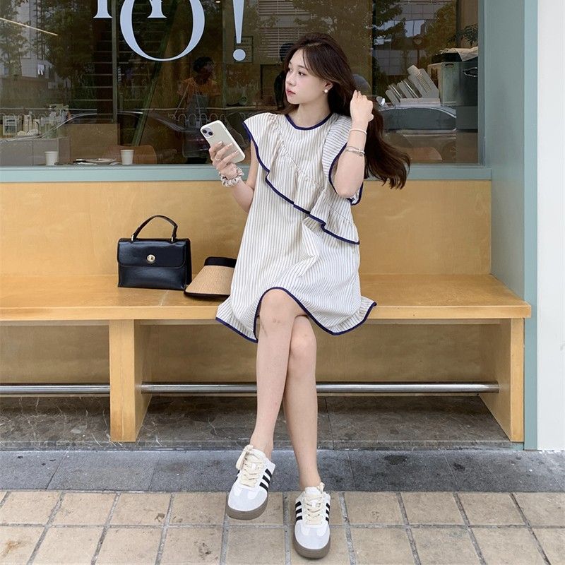 条纹小飞袖连衣裙女夏季新款韩系荷叶边不规则无袖娃娃衫裙子 服裝批發女裝批發服飾貨源