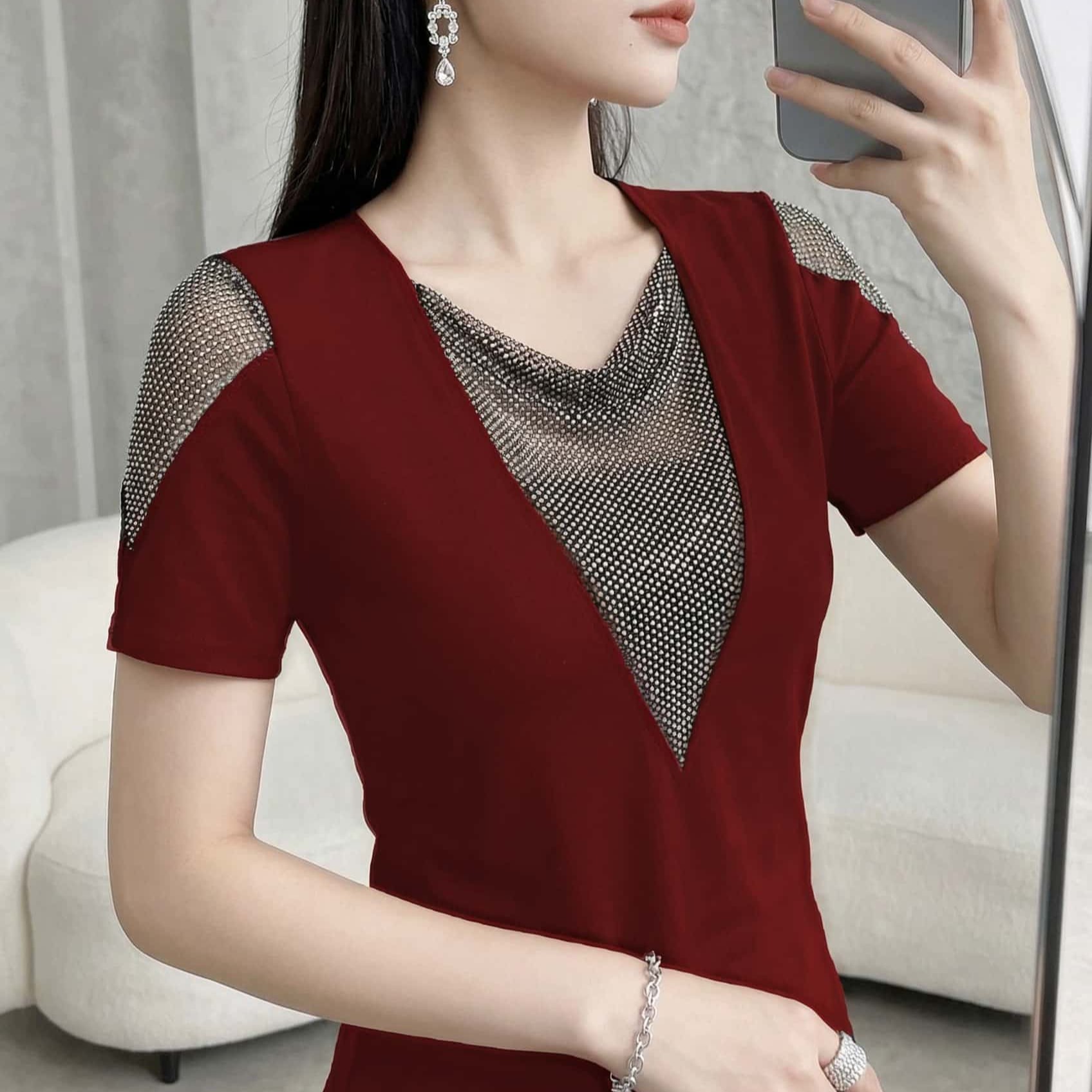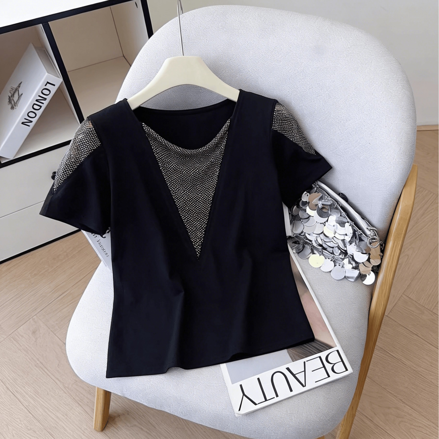 夏季新款短袖优雅烫钻针织套头女士上衣棉质高弹收腰时尚T恤 服裝批發女裝批發服飾貨源
