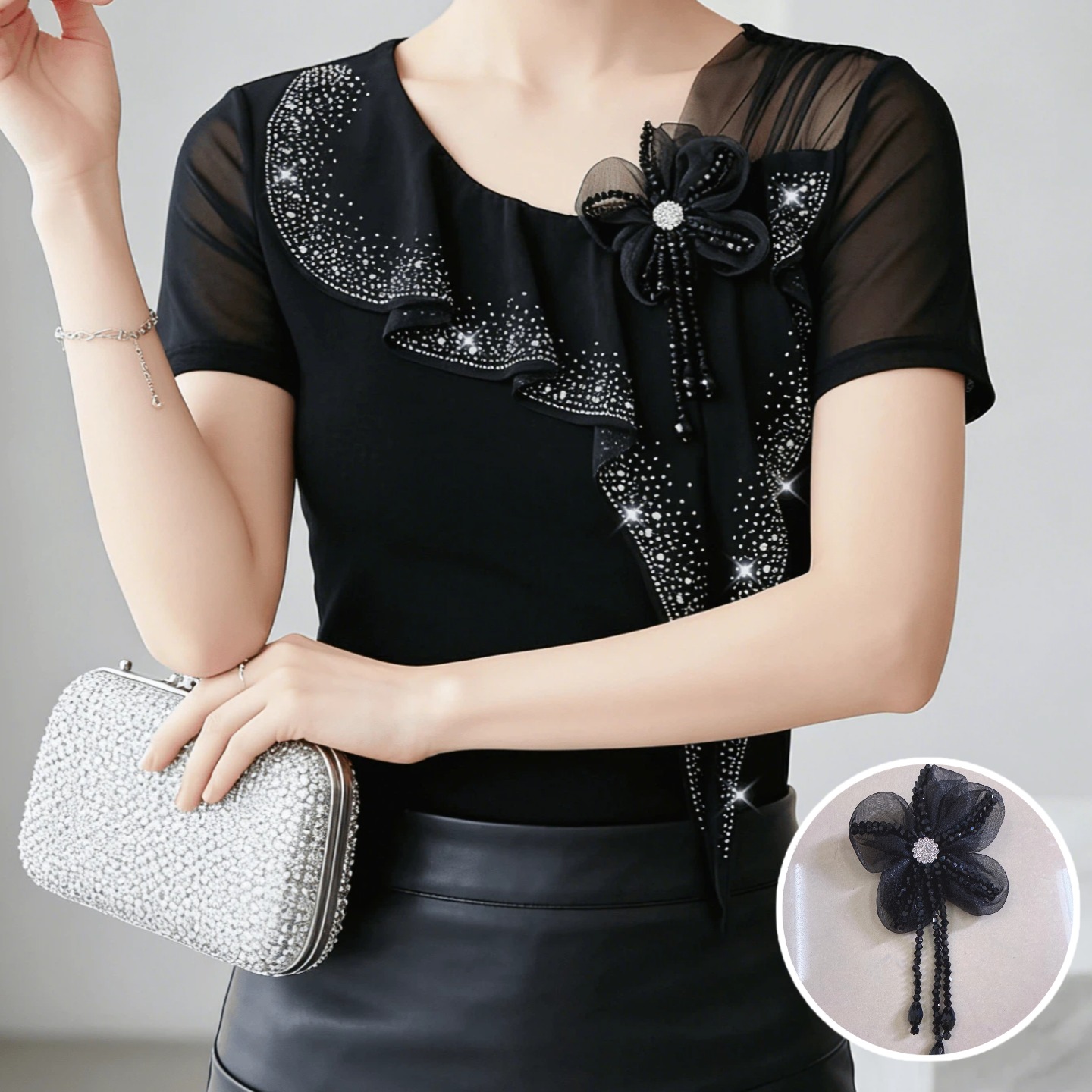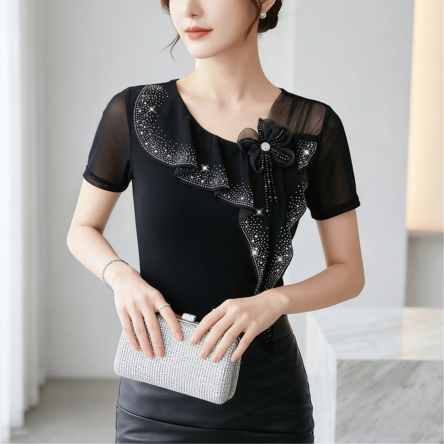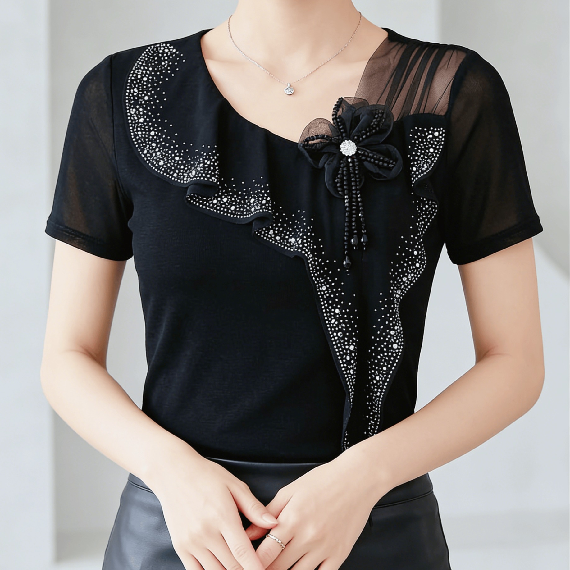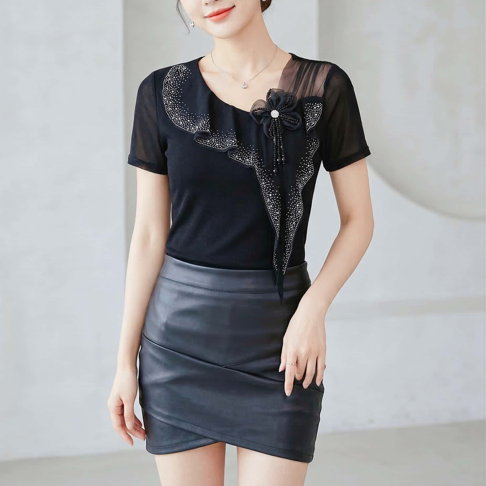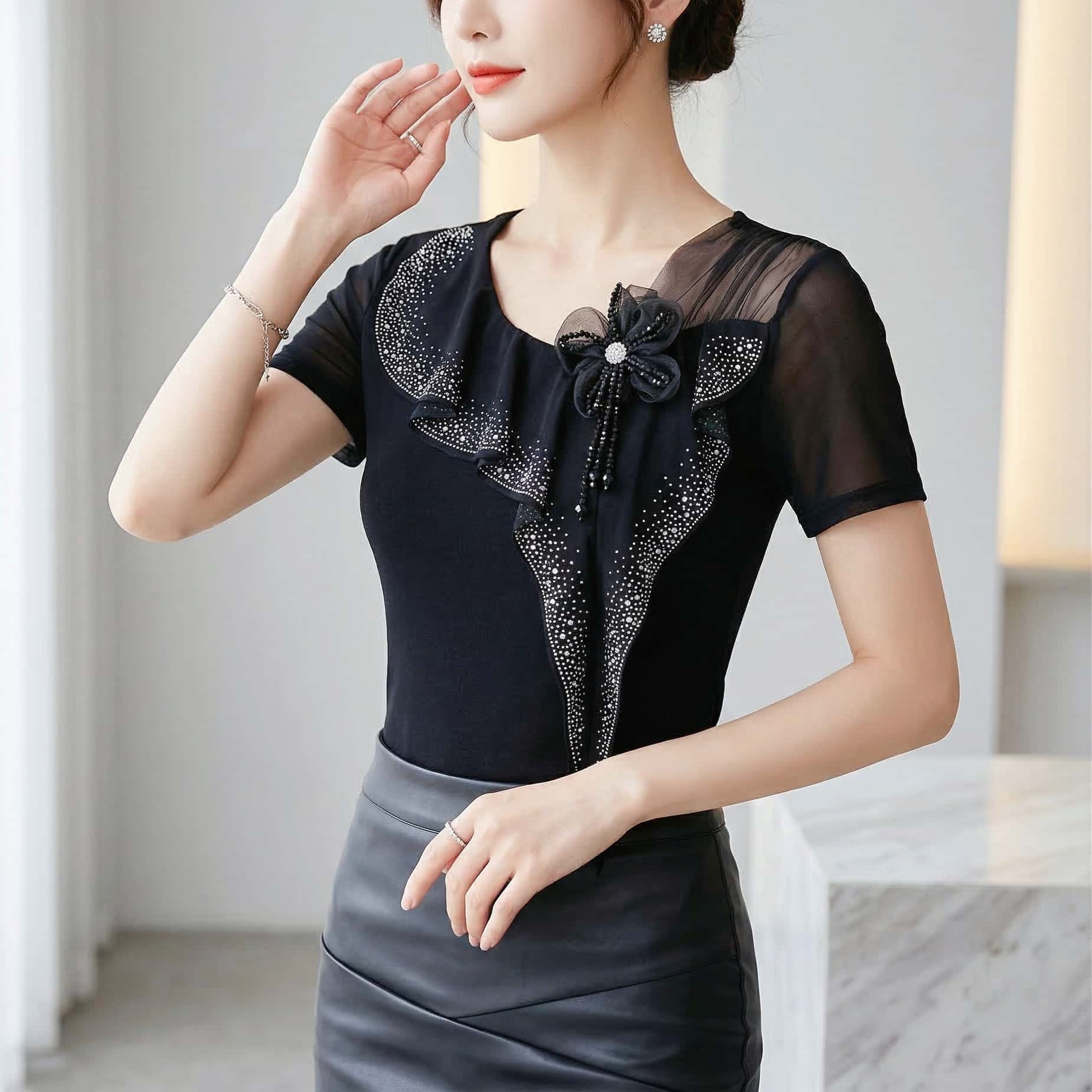 夏季新款斜领短袖重工烫钻优雅上衣女高弹网纱面料手工花朵配饰T 服裝批發女裝批發服飾貨源