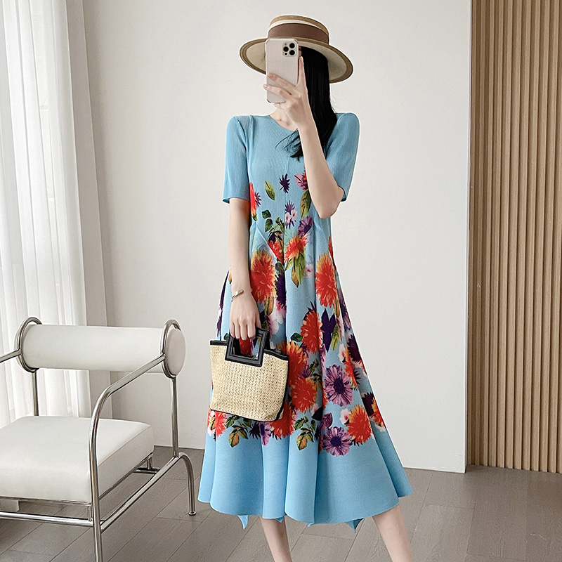 BY16090# 连衣裙新款褶皱新中式衣服裙子女春季复古印花国风印花弹簧裙 服裝批發女裝批發服飾貨源