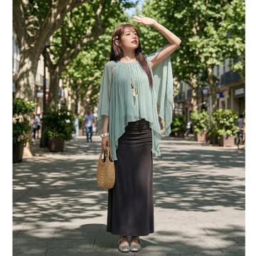 沙绿色衬衫+深灰色半身裙