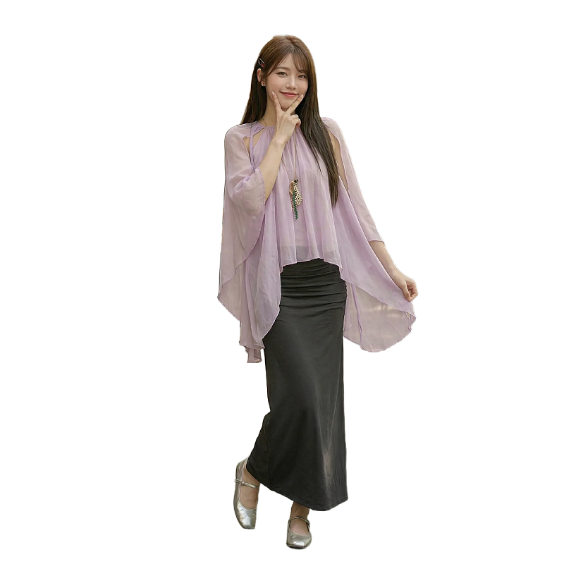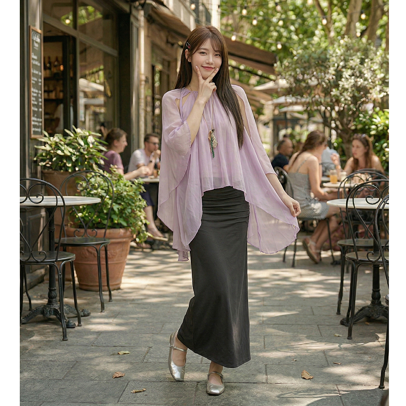 丁香粉色衬衫+深灰色半身裙