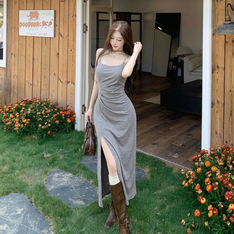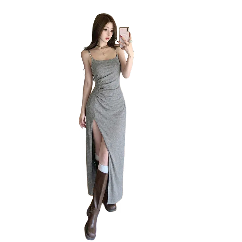 纯欲风皱褶显瘦吊带连衣裙夏季新款修身气质开叉包臀长裙 服裝批發女裝批發服飾貨源