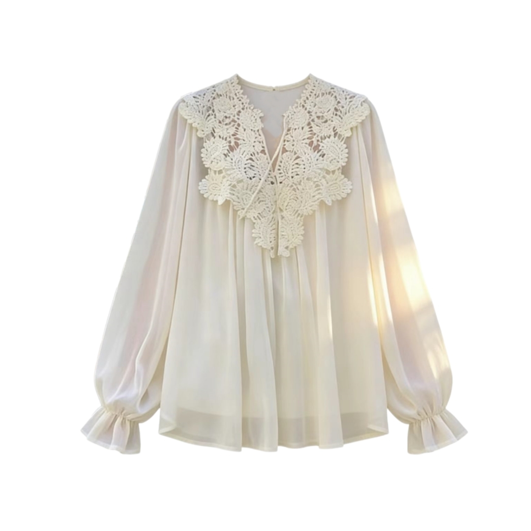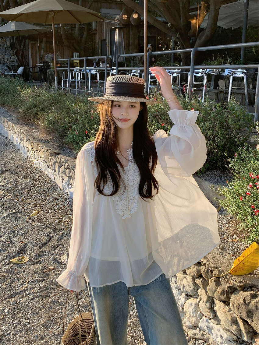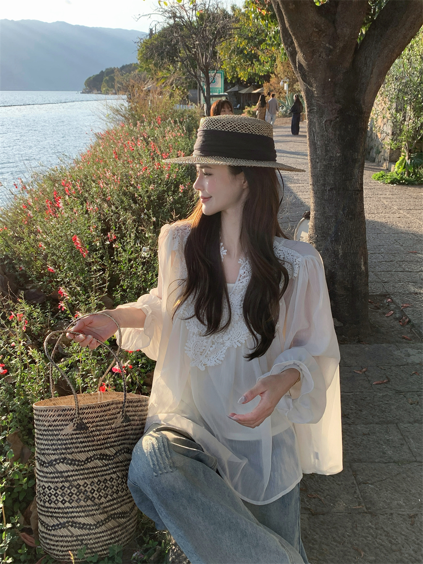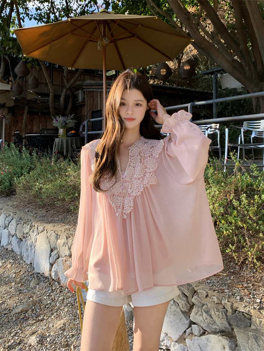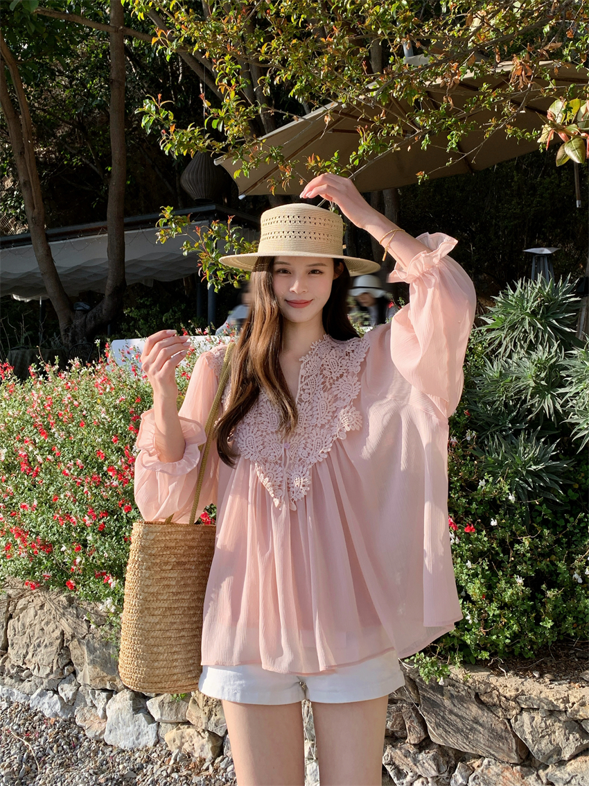 宽松雪纺花边衬衫,面料手感很顺滑