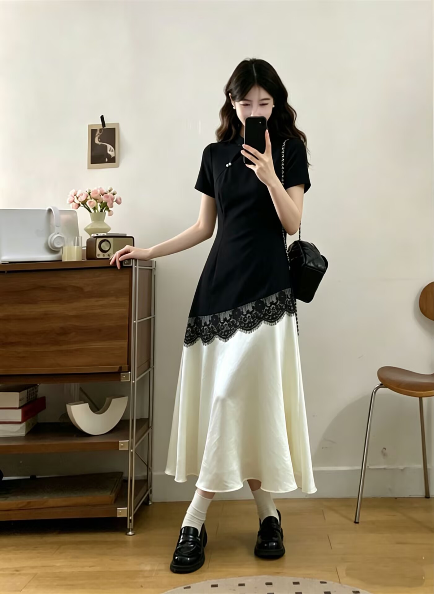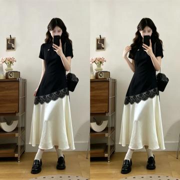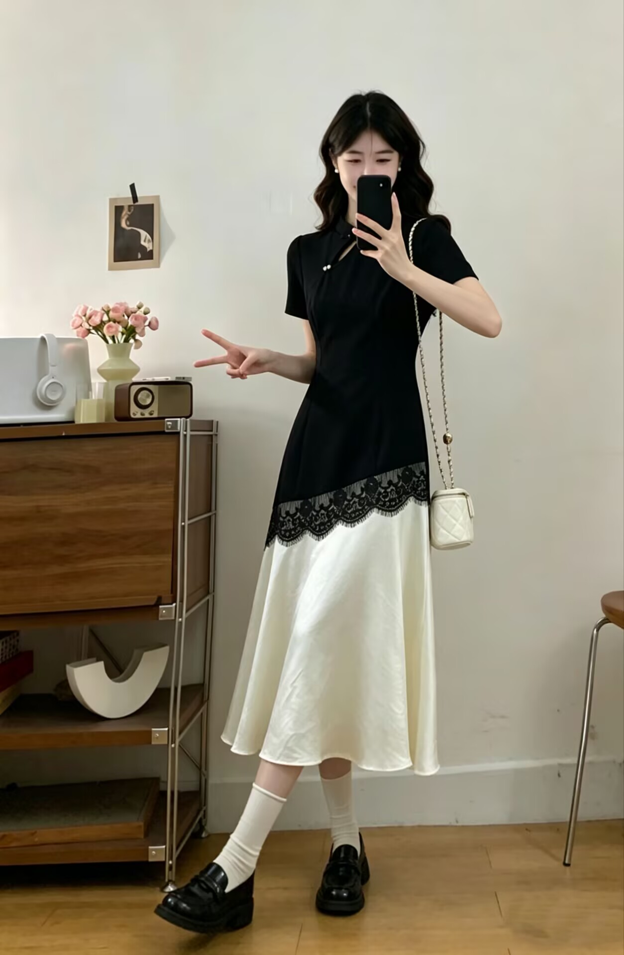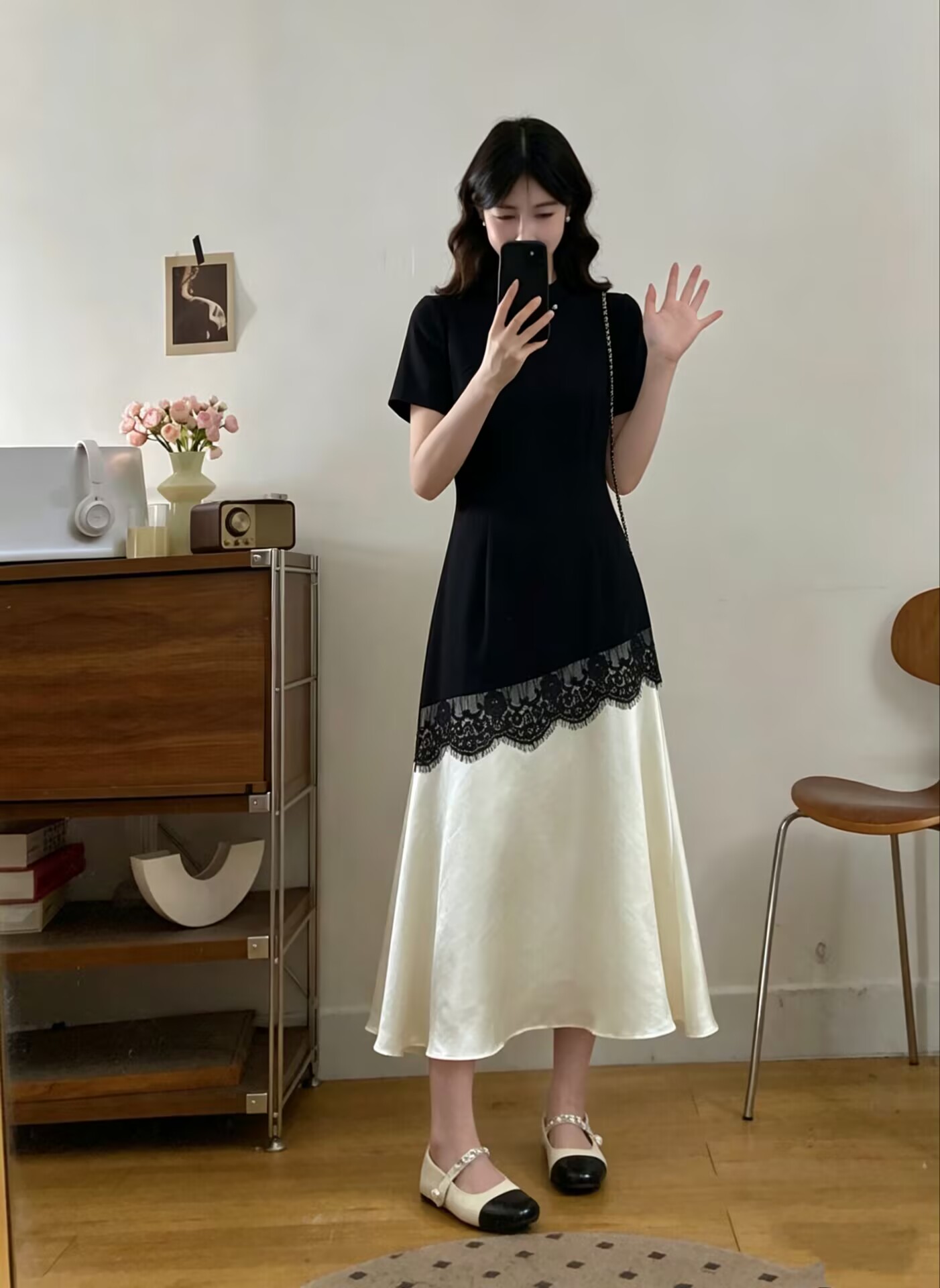 大码女装夏季新中式黑白撞色蕾丝通勤收腰显瘦气质连衣裙 服裝批發女裝批發服飾貨源