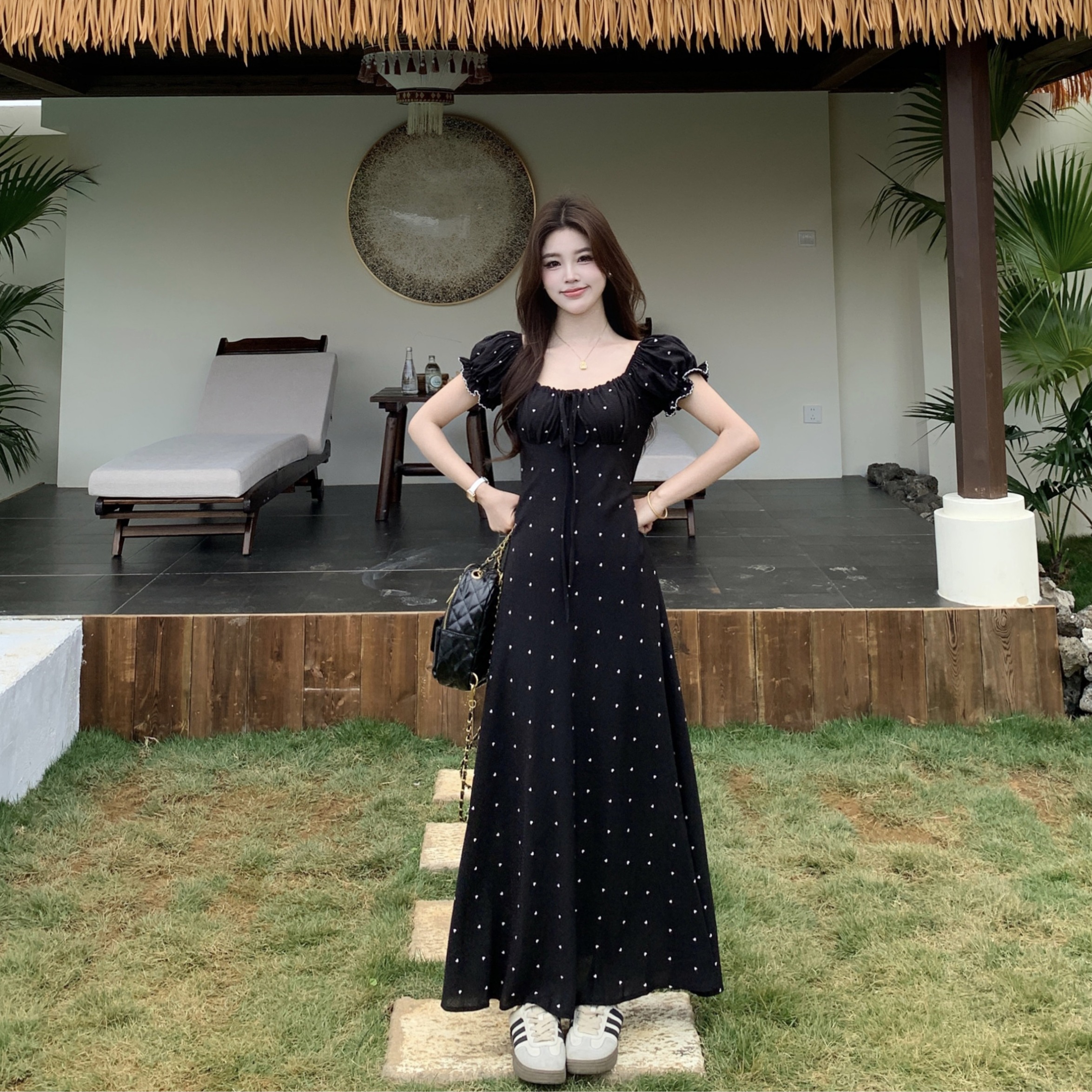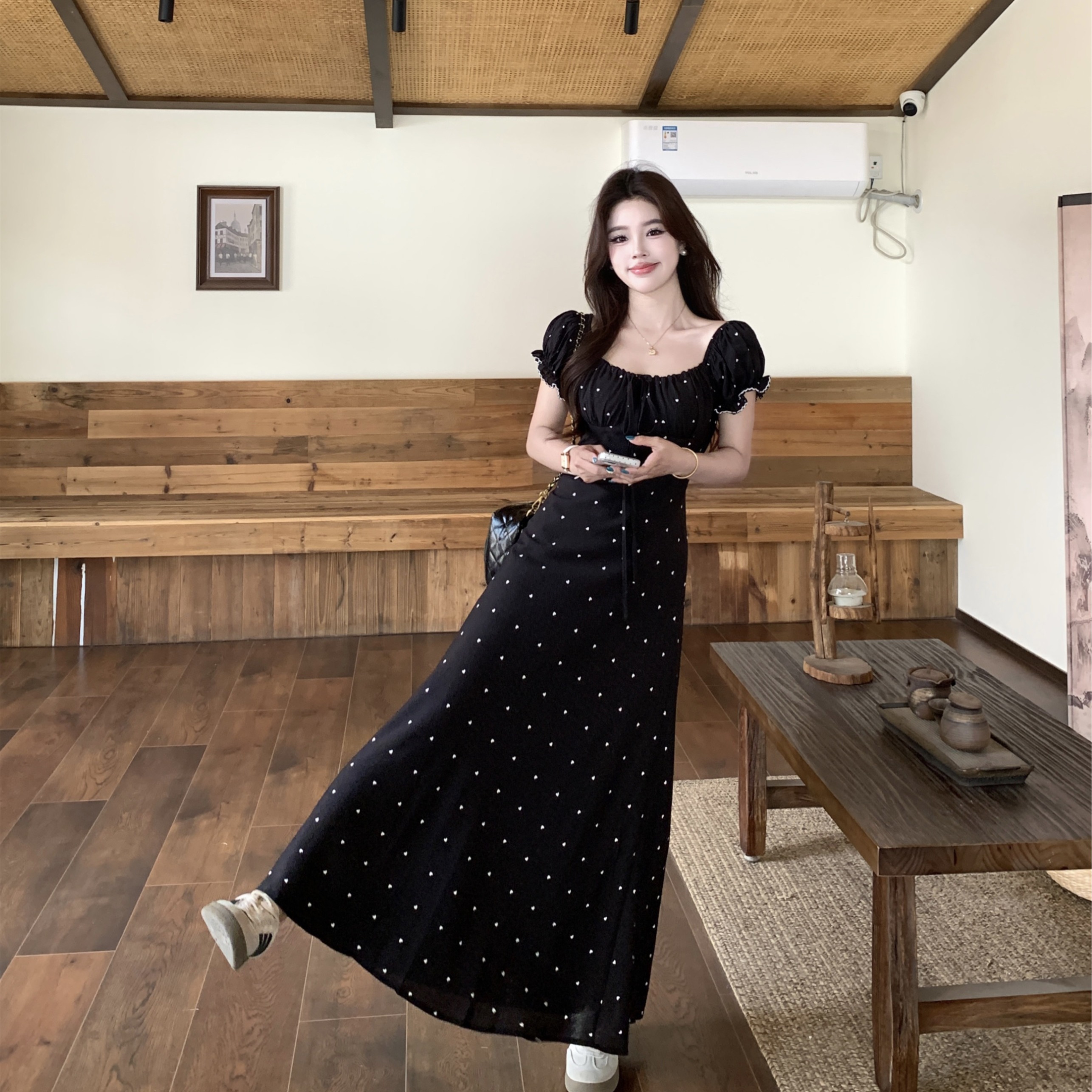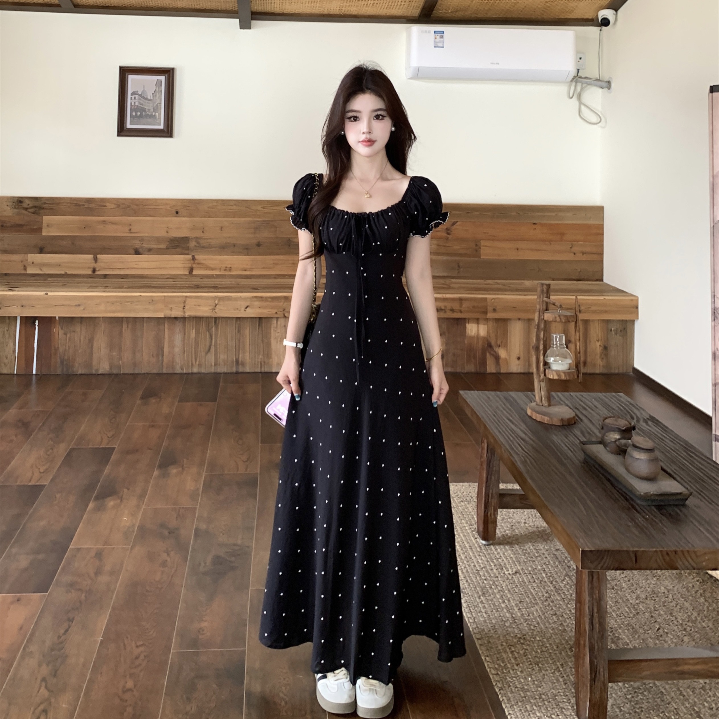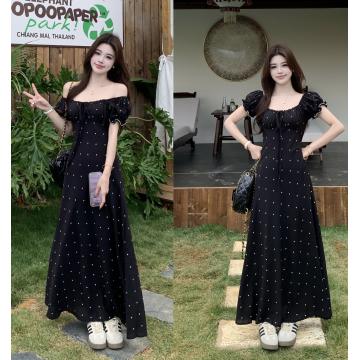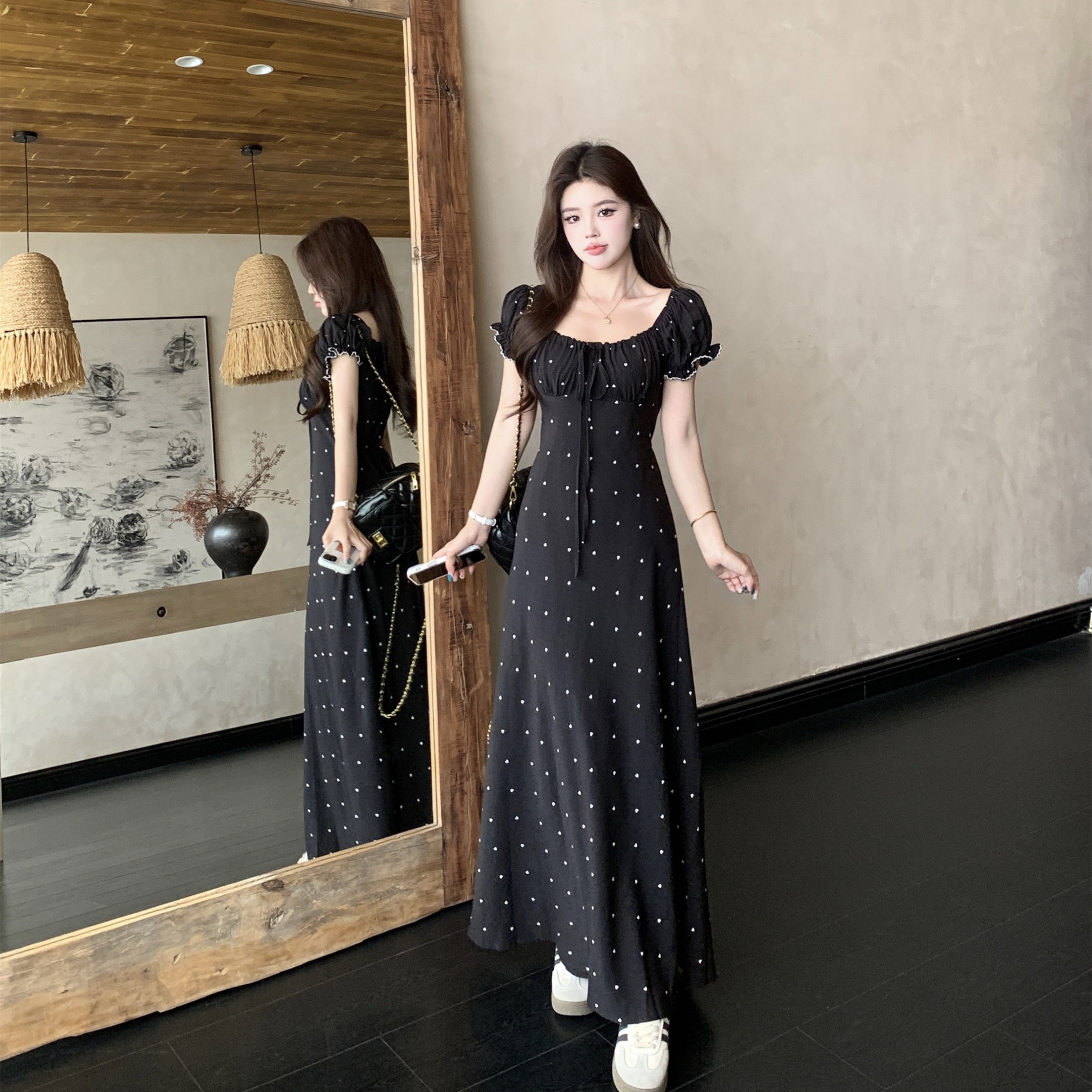 大码夏季法式复古设计感收腰显瘦短袖连衣裙爱心雪纺长裙 服裝批發女裝批發服飾貨源