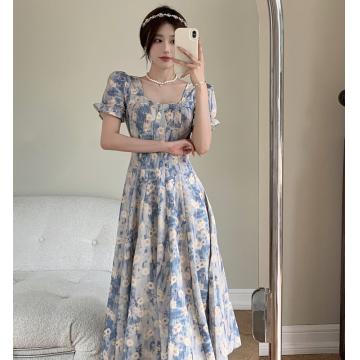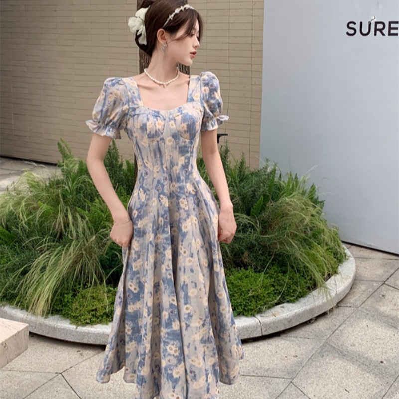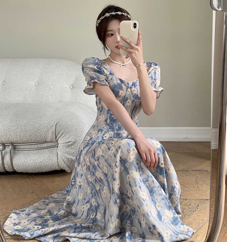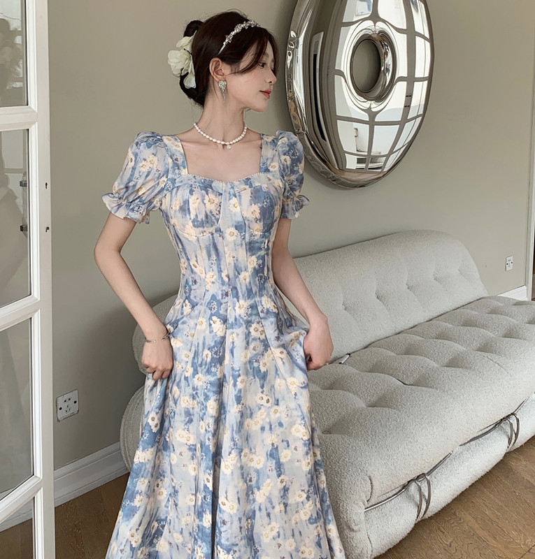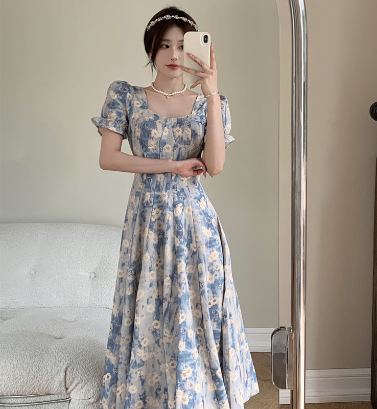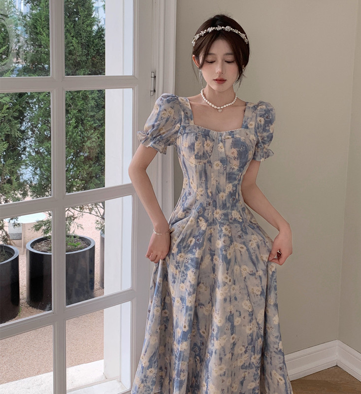 大码法式方领蓝色油画碎花连衣裙女夏收腰显瘦初恋长裙 服裝批發女裝批發服飾貨源