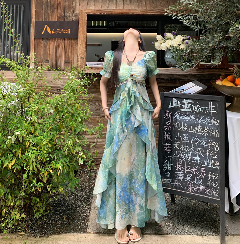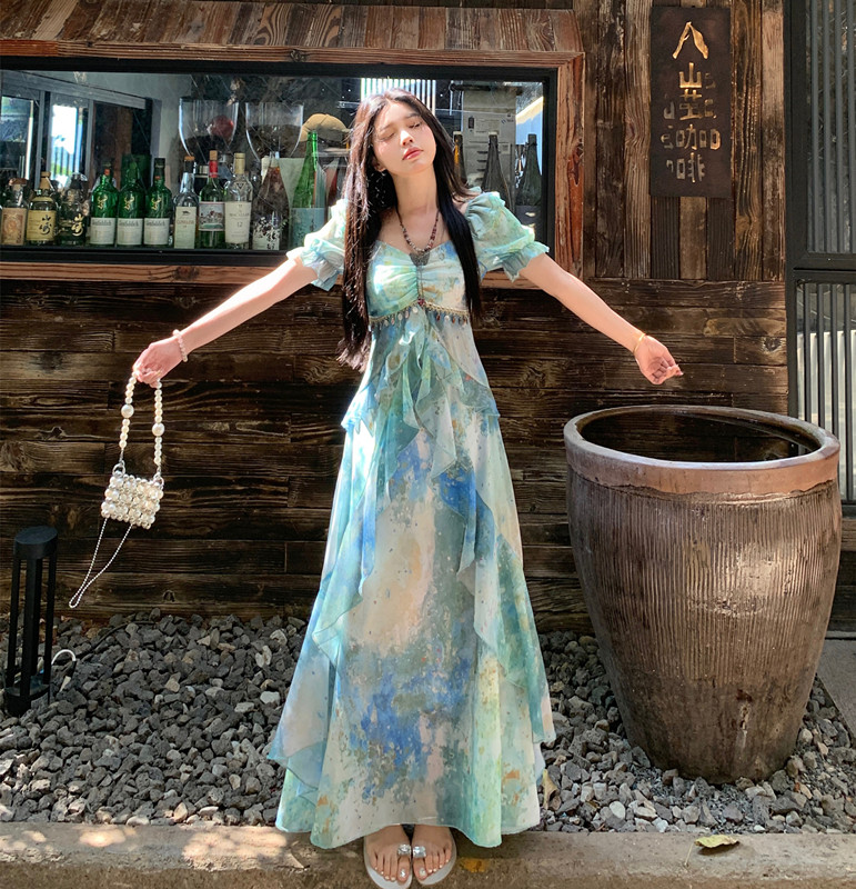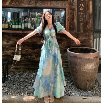 大码夏季新款法式甜美气质雪纺连衣裙度假风遮肉油画长裙女 服裝批發女裝批發服飾貨源