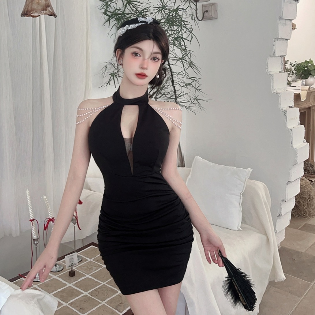 珍珠挂脖吊带连衣裙女修身显瘦性感包臀裙名媛风约会小礼裙 服裝批發女裝批發服飾貨源