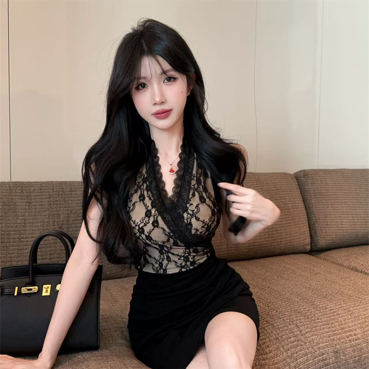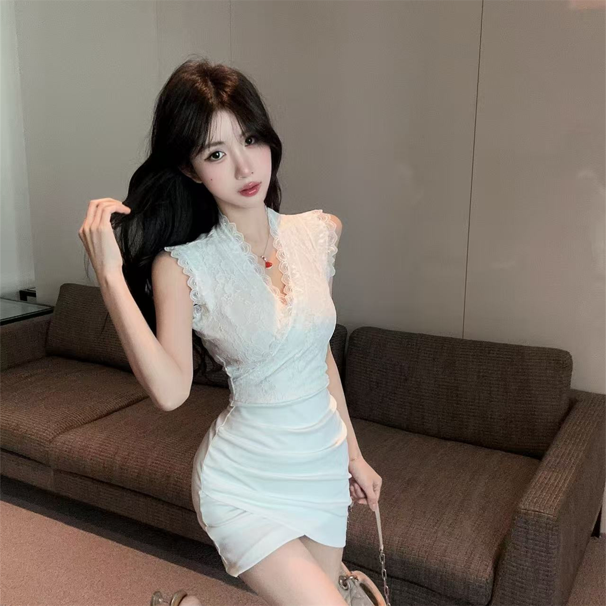性感蕾丝拼接V领连衣裙女修身收腰显瘦包臀裙气质名媛风短裙 服裝批發女裝批發服飾貨源